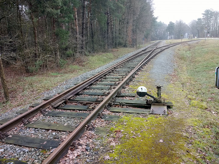 Die Handweiche 1 liegt in der Grundstellung und zeigt In Richtung Recke-Osnabrück. Stellt man die Weiche, kann man nach Fiege oder zum Hafen am Mittellandkanal fahren."