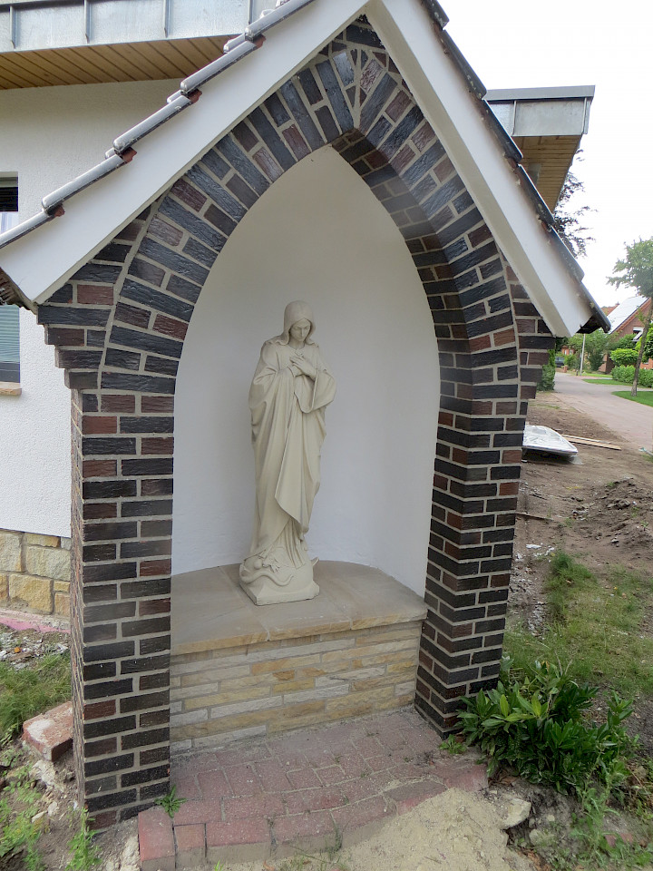 Unser Bild zeigte den Sockel der Muttergottes-Statue im Muttergottes-Häuschen Am Flüddert. Unter ihrem Gewandsaum lugt ein Schlangenkopf hervor.