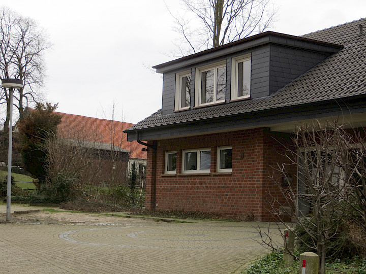 Geplant ist, links vor dem Gebäude (siehe Foto), wo vormals das „Agaven-Beet“ war, zwei behindertengerechte Parkplätze anzulegen. Dazu soll die Pflasterfläche mit 6-Eck-Pflaster bis an das Pfarrheim herangeführt werden.