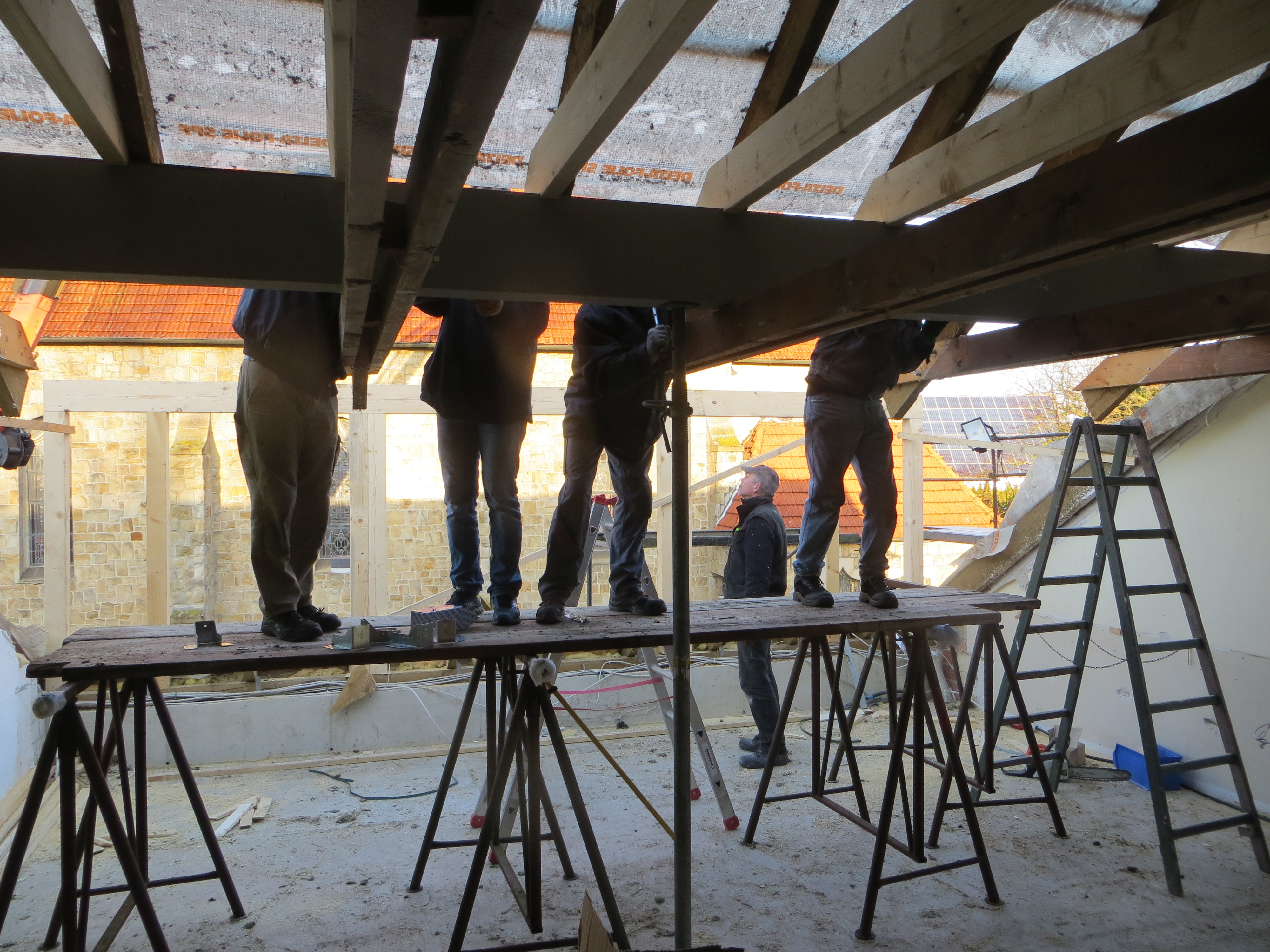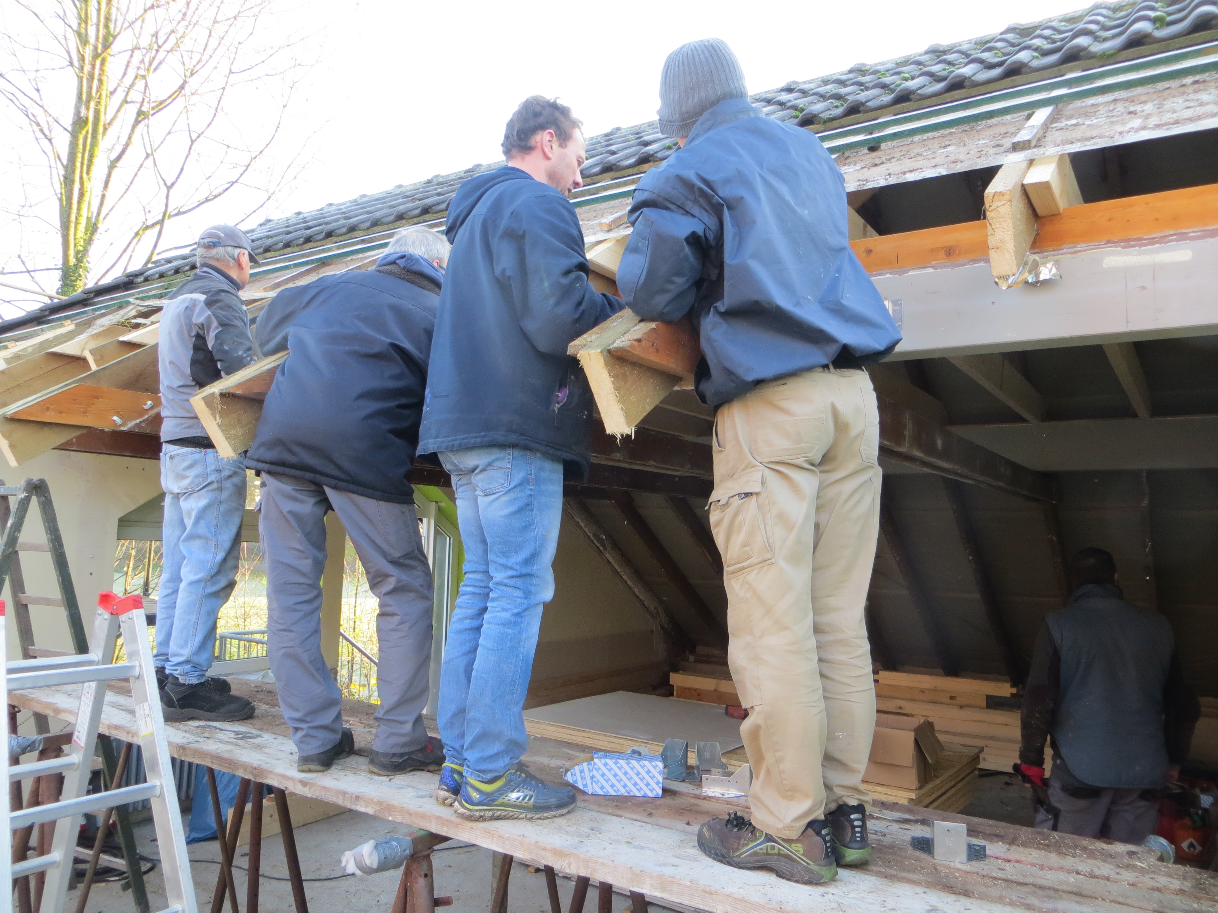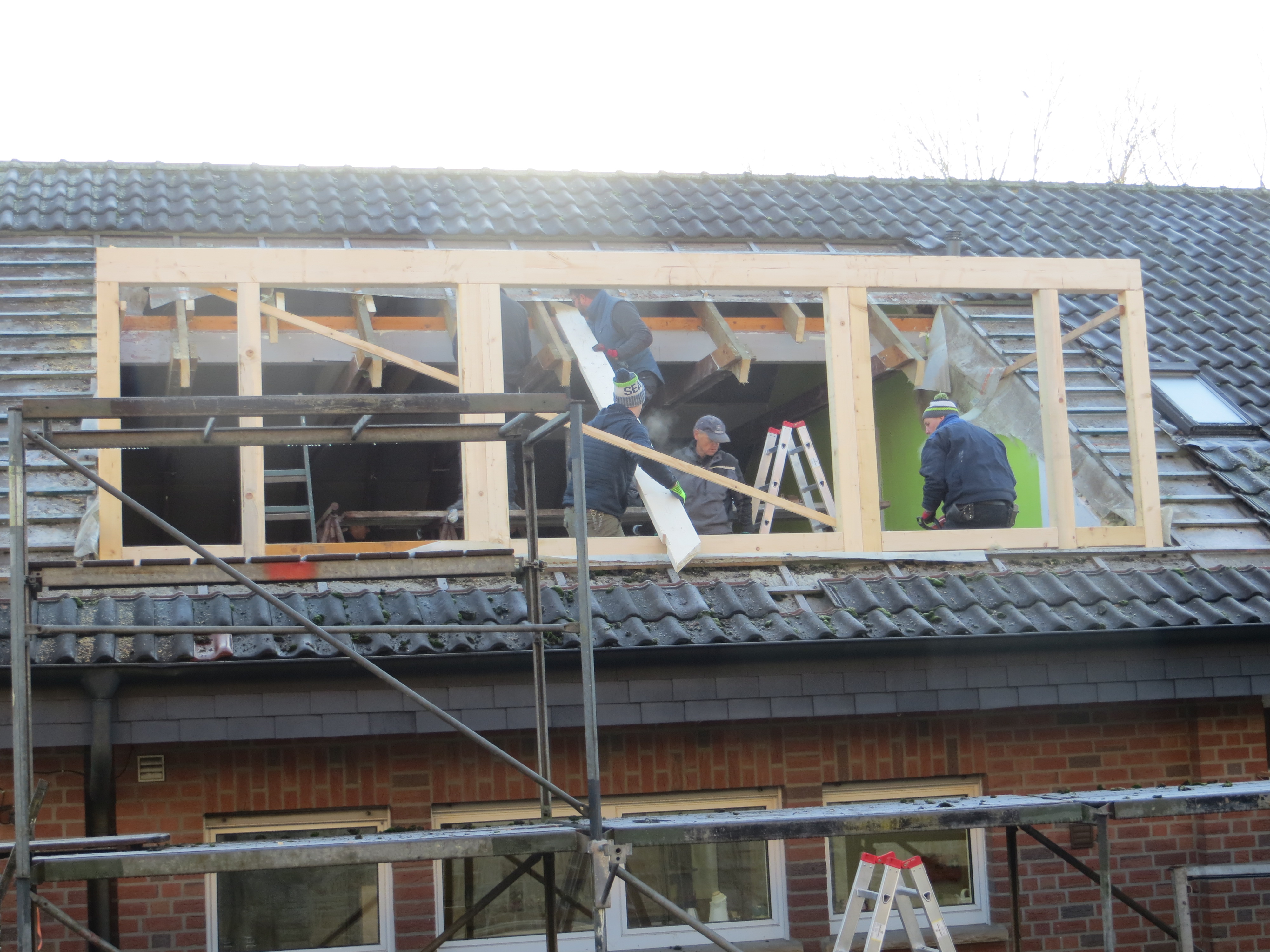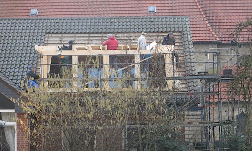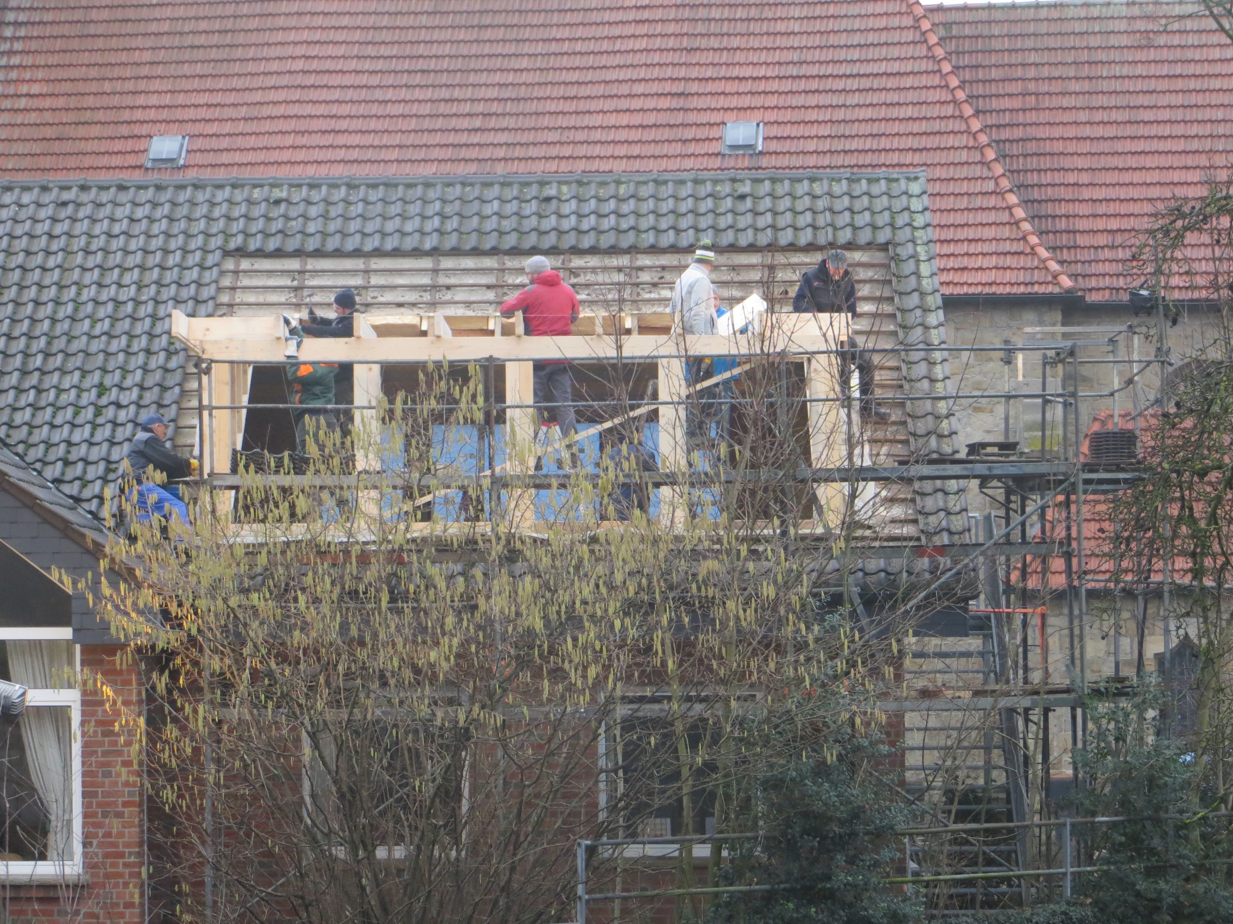 Ende Januar wurde die zweite Dachgaube von den Zimmerleuten und ihren Helfern errichtet. Die Außenarbeiten an der ersten Dachgaube, wie Klempnerarbeiten durch Heinz Horstmann (Dachrinnen und Fensterbänke), Dachabdichtung und Verkleidung der Außenseiten nahmen dann gut zwei Wochen in Anspruch. Die „Rentner“, die sich tagsüber dort engagierten und bei feuchtem und kaltem Wetter auf Dach und Gerüst rumkletterten, hatten zwar guten Willen und auch die nötigen Kenntnisse, aber wegen mangelnder Routine, bei denen, die das nicht beruflich gemacht hatten, dauerte es dann doch etwas länger.