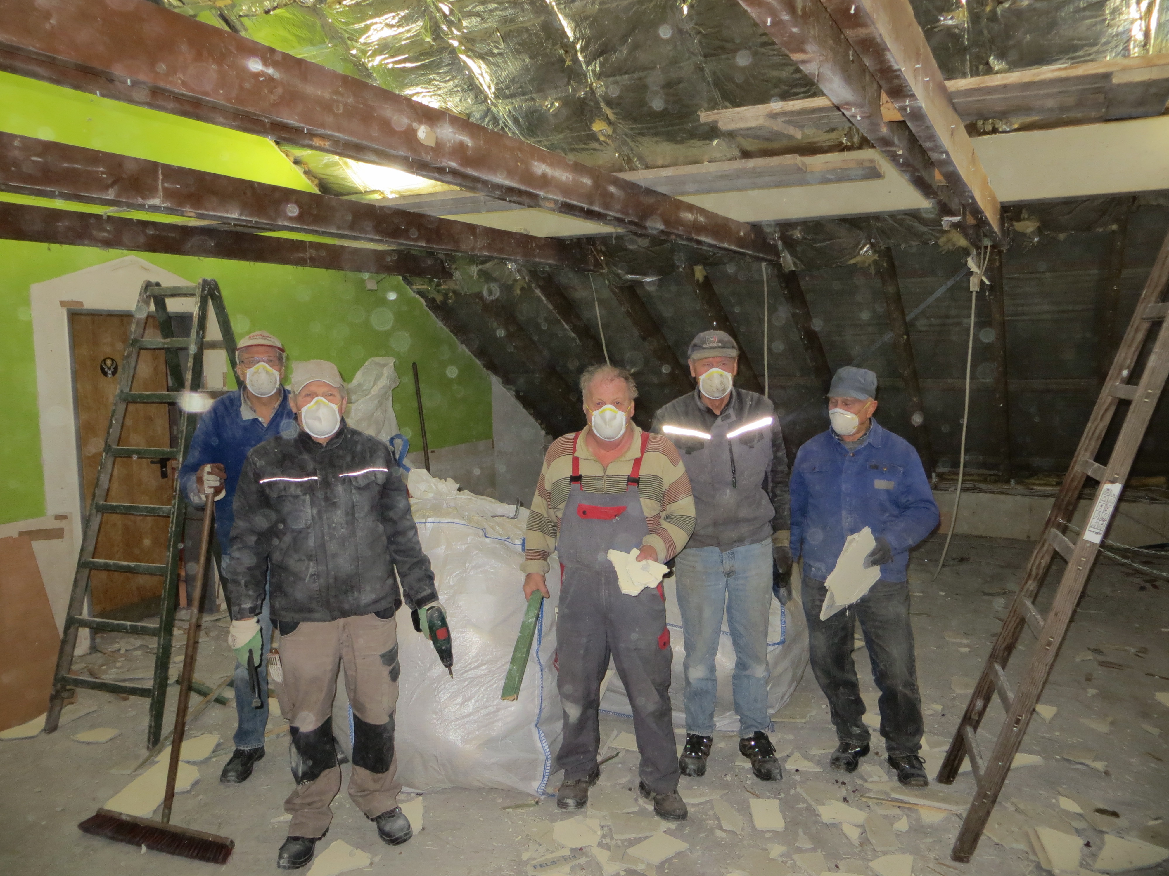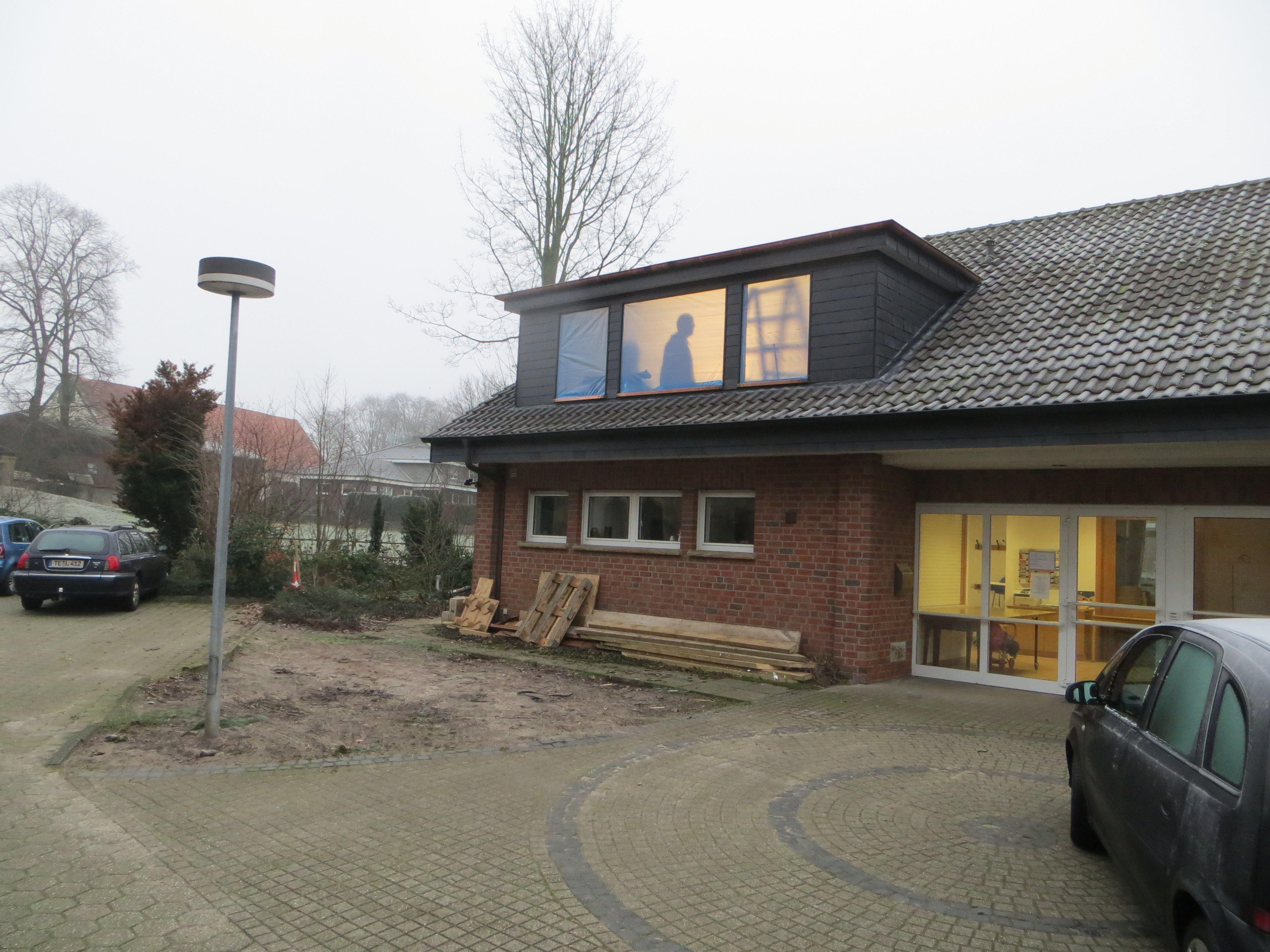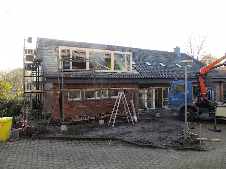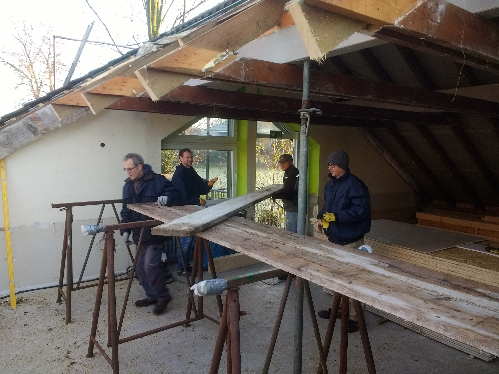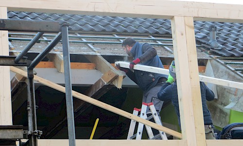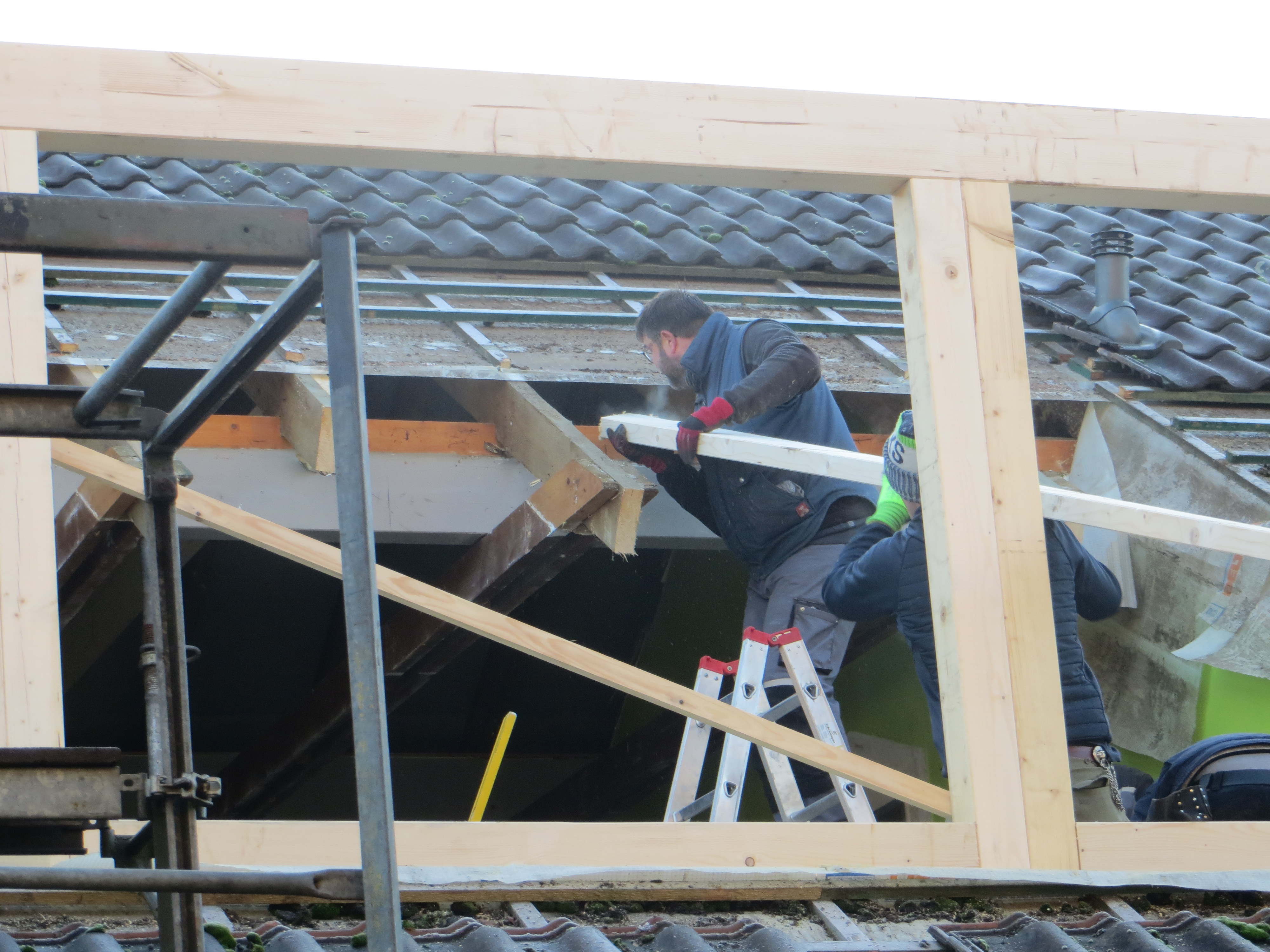 Ende Januar wurde die zweite Dachgaube von den Zimmerleuten und ihren Helfern errichtet. Die Außenarbeiten an der ersten Dachgaube, wie Klempnerarbeiten durch Heinz Horstmann (Dachrinnen und Fensterbänke), Dachabdichtung und Verkleidung der Außenseiten nahmen dann gut zwei Wochen in Anspruch. Die „Rentner“, die sich tagsüber dort engagierten und bei feuchtem und kaltem Wetter auf Dach und Gerüst rumkletterten, hatten zwar guten Willen und auch die nötigen Kenntnisse, aber wegen mangelnder Routine, bei denen, die das nicht beruflich gemacht hatten, dauerte es dann doch etwas länger.