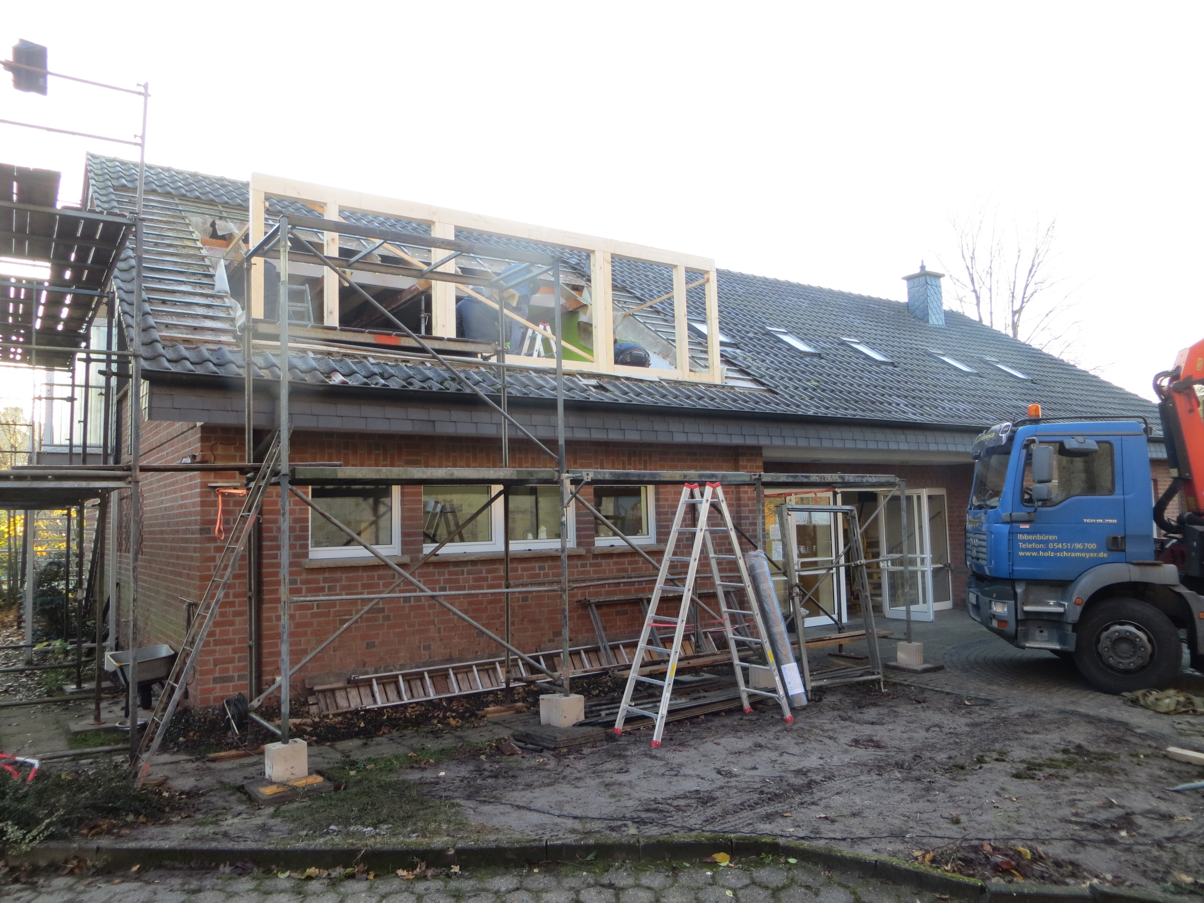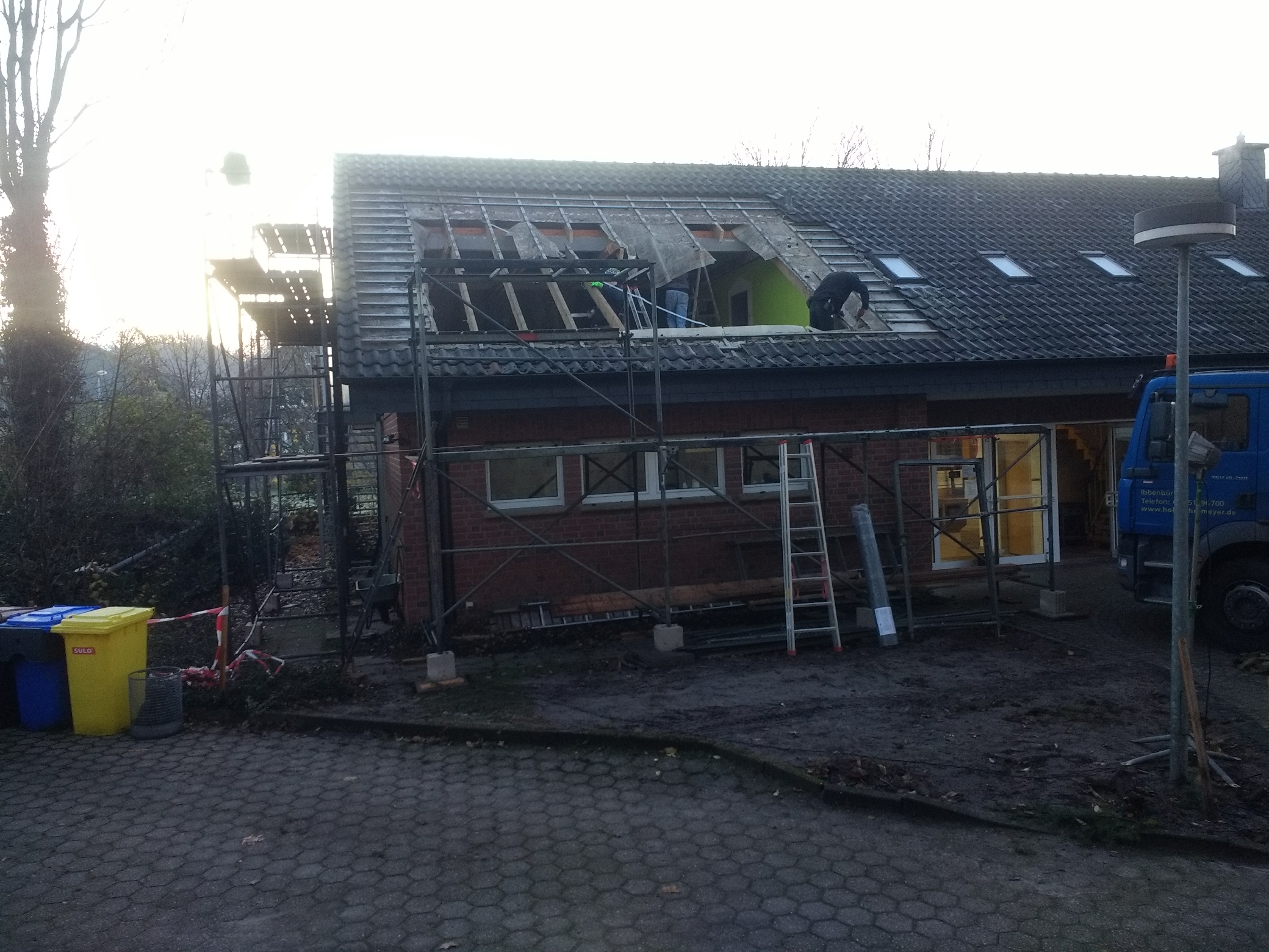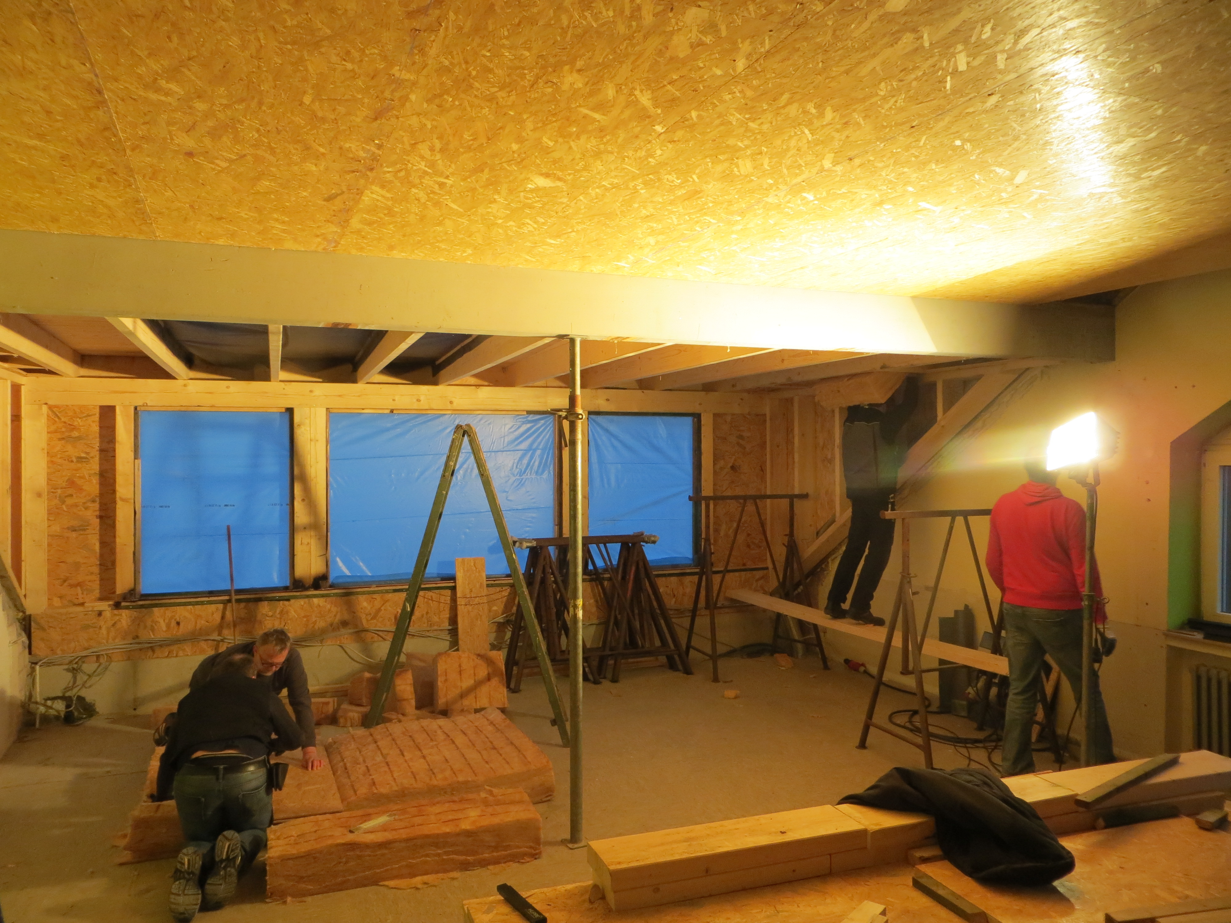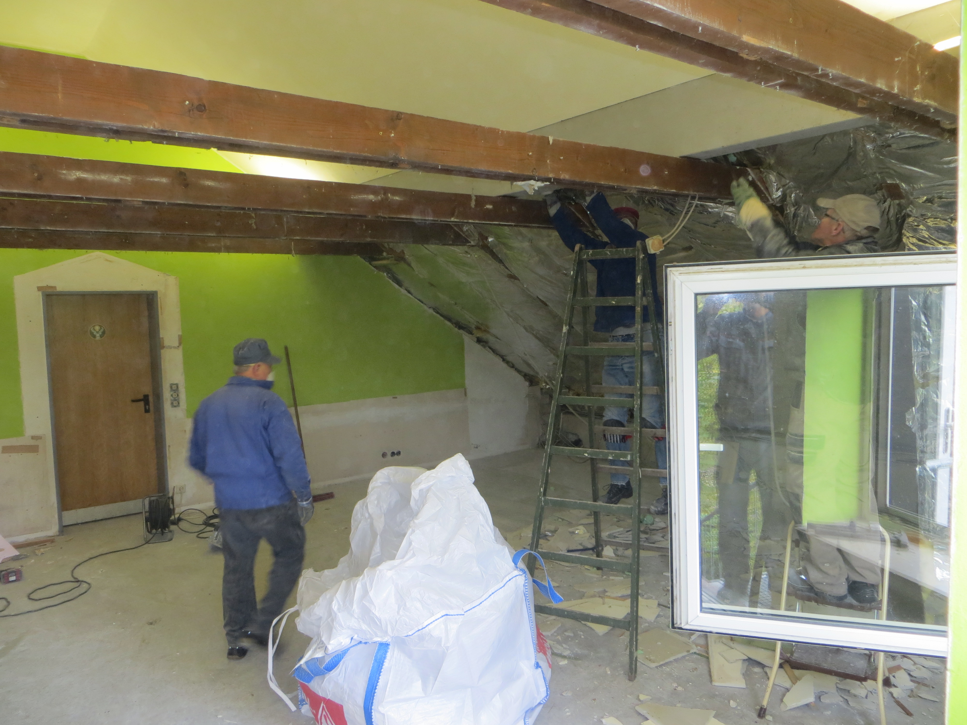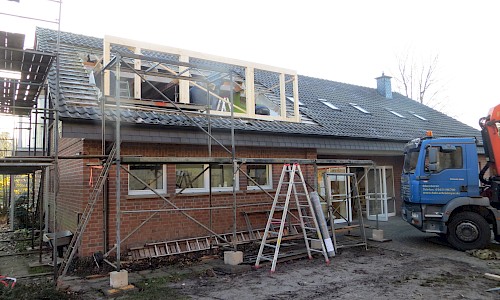 Ende Januar wurde die zweite Dachgaube von den Zimmerleuten und ihren Helfern errichtet. Die Außenarbeiten an der ersten Dachgaube, wie Klempnerarbeiten durch Heinz Horstmann (Dachrinnen und Fensterbänke), Dachabdichtung und Verkleidung der Außenseiten nahmen dann gut zwei Wochen in Anspruch. Die „Rentner“, die sich tagsüber dort engagierten und bei feuchtem und kaltem Wetter auf Dach und Gerüst rumkletterten, hatten zwar guten Willen und auch die nötigen Kenntnisse, aber wegen mangelnder Routine, bei denen, die das nicht beruflich gemacht hatten, dauerte es dann doch etwas länger.