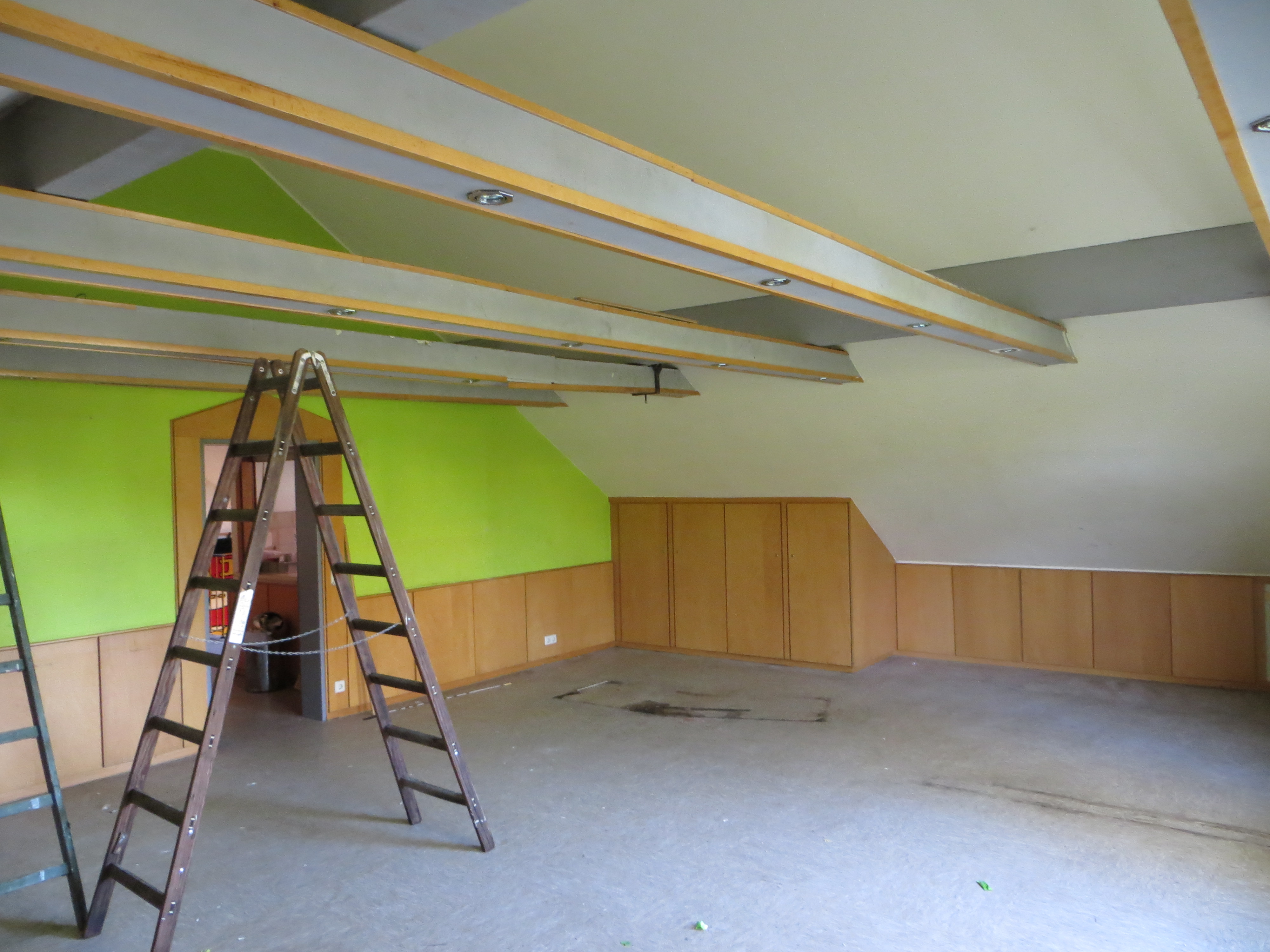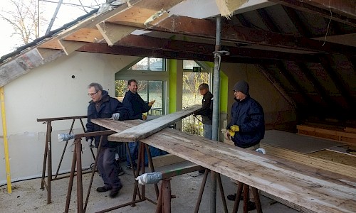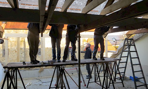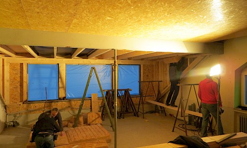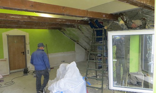 Die Außenarbeiten am Dach sind damit abgeschlossen. Jetzt kann es witterungsunabhängig innen weitergehen. Auch hier sind schon deutliche Fortschritte zu erkennen. Immer dann, wenn man draußen z. B. wegen des Wetters nicht arbeiten konnte, wurde drinnen gewerkelt.