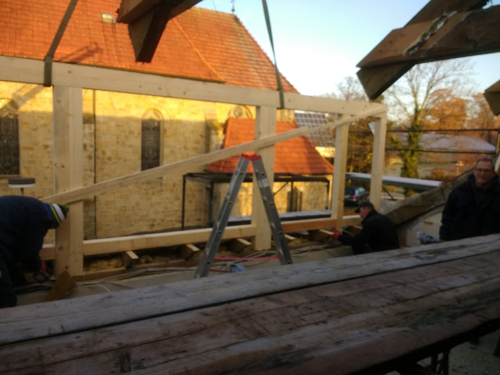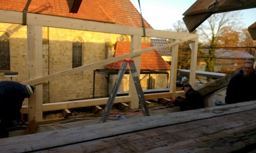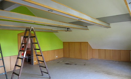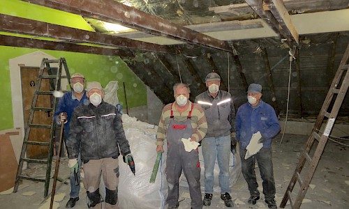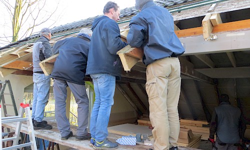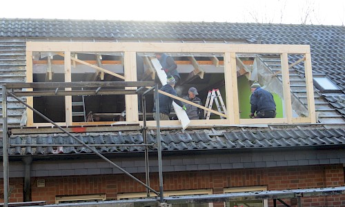 Danach wird es wohl mit dem Vorraum und den Toiletten weitergehen. Dass diese Sanierung erforderlich ist, zeigt sich inzwischen überdeutlich. Die Verhandlungen über eine Beteiligung der Kirchengemeinde laufen. Die „Helferlage“ ist gut. Die „Rentner“ haben insbesondere „unter der Woche“ während des Tages gearbeitet, um einen guten Arbeitsfortschritt zu erreichen und die Dachaußenhaut wieder zügig zu schließen. Die Berufstätigen steigen an den Wochenenden und nach Feierabend mit ein. So waren sie insbesondere beim Abdecken des Daches und beim Errichten der Dachausbauten, das jeweils freitags und samstags stattfand, tätig. Hier ein besonderes Dankeschön an die Zimmerleute Thomas Schmohl und Jürgen Grotemeier, die die Errichtung der Dachgauben verantwortlich leiteten. Mit dem Ergebnis sind alle zufrieden. Was bis jetzt erreicht wurde, kann sich sehen lassen.