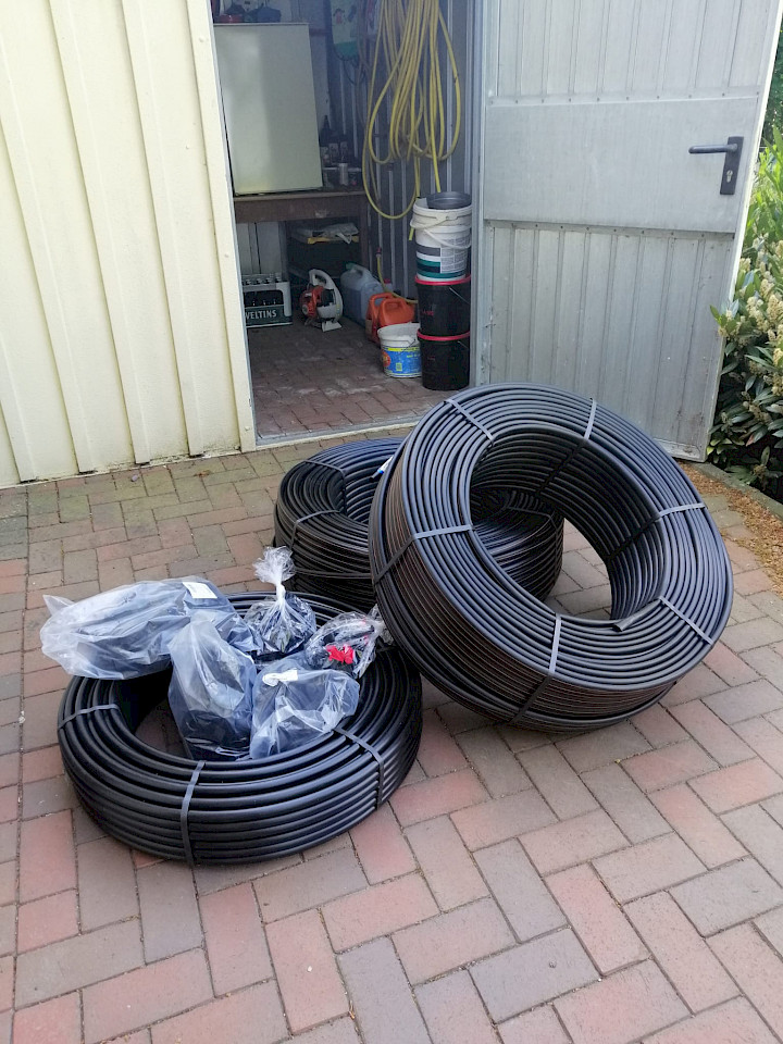 Mit fachlicher Beratung durch Julian Plagemann, der über einschlägige Erfahrungen aus seinem Gemüseanbau verfügt, wurde das notwendige Material bestellt: 300 m Tropfschlauch, Lochabstand 30 cm, Durchlauf 1,6 l in der Stunde, dazu Steckverbinder, T-Verbinder, Endstücke, Erdspieße, Schlauchschellen und, und und…., eine Menge Kleinteile.