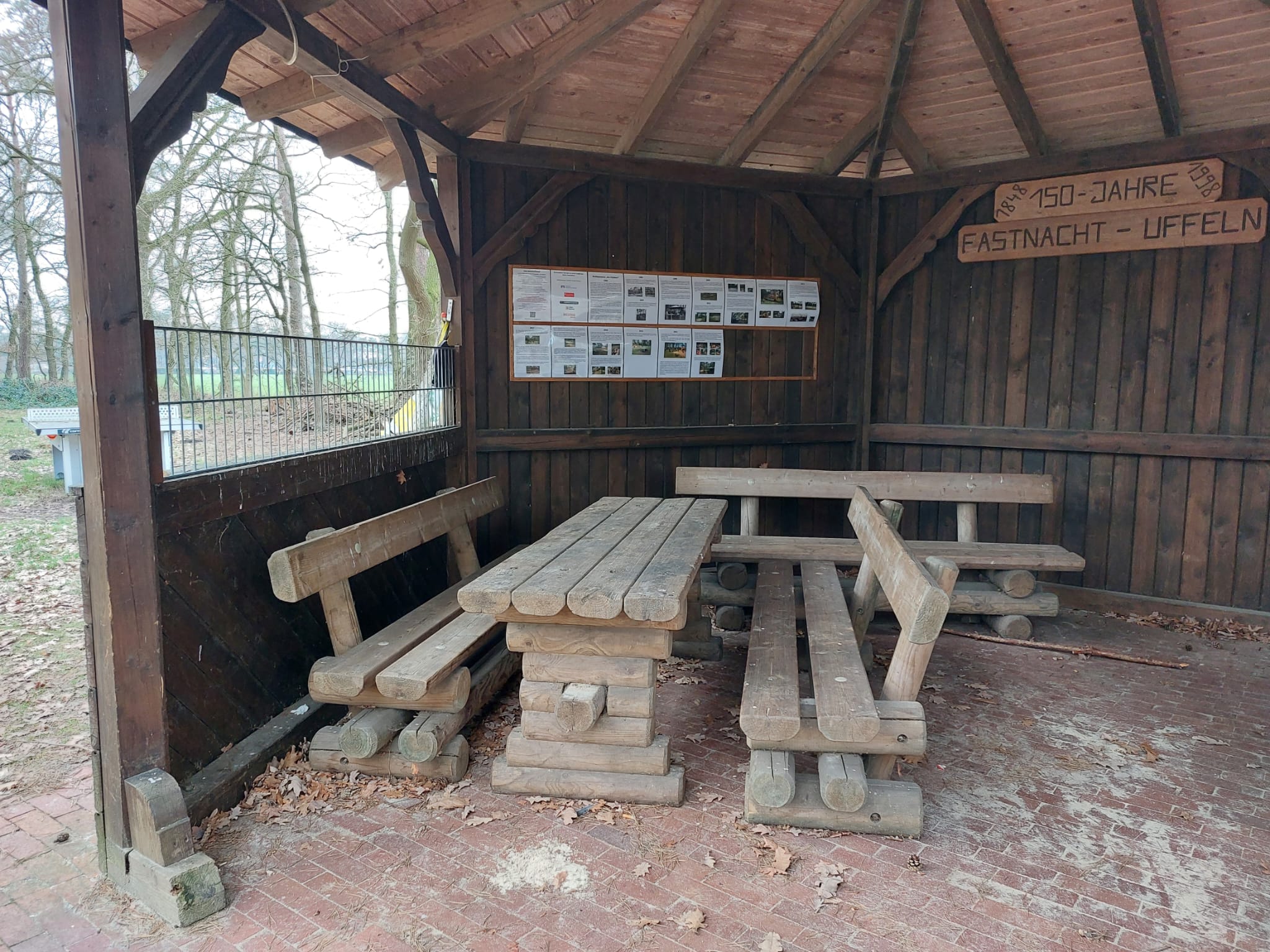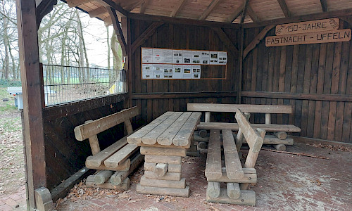 Die Sitzgruppe in der Wetterschutzhütte, immerhin schon 25 Jahre alt und in die Jahre gekommen, weist Mängel auf, die auch vom Spielplatzprüfer festgestellt wurden. Sie soll ersetzt werden durch eine ähnliche neue Sitzgruppe. Vorgesehen ist, die alten Sitzmöbel aufzuarbeiten und für eine Restzeit im Umfeld des Spielplatzes zu verwenden. Darüber hinaus sollen eine drehbare Waldliege (Waldsofa) und eine sogenannte Jugendbank zusätzlich neu aufgestellt werden. Weiterhin muss die Wetterschutzhütte repariert werden. Das Dach hat bei dem Stürmen im letzten Jahr Schaden genommen und wurde nur notdürftig repariert. Es soll nun fachmännisch instandgesetzt werden. Und nach 25 Jahren ist auch ein neuer Schutzanstrich fällig.