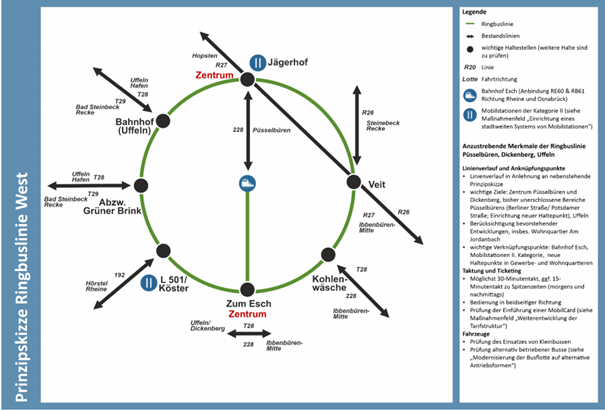 Ein interessanter Aspekt sind die vorgeschlagenen Ringbuslinien. Drei sollen es sein, Ost, Mitte und West (Langfassung S. 49 ff.) Sie würden die vorhandenen Buslinien ergänzen und Uffeln mit dem Bahnhof Esch in Halbstunden-Taktzeiten verbinden.