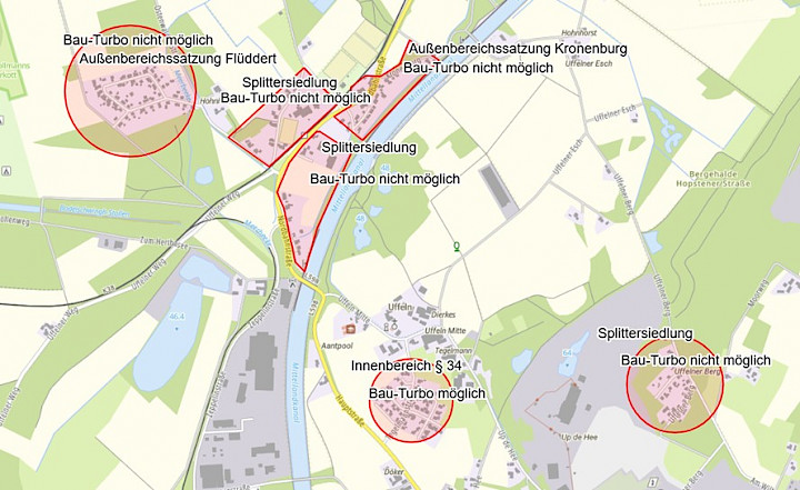 Wilfried Kampmann und Dennis Menger erläuterten den Bau-Turbo und die sich daraus möglicherweise für Uffeln ergebenden Chancen. Da der Bau-Turbo nur im Bereich von Bebauungsplänen und in sog. Innenbereichen gem. § 34 BauGB anwendbar ist, reduzieren sich die Möglichkeiten in Uffeln auf die Tegelmann-Siedlung. Hier könnten die Regeln des Bau-Turbos angewandt werden, allerdings nur, wenn auch die sonstigen immissionsrechtlichen Voraussetzungen vorliegen, also die Grenzwerte der Geruchsbelastung und der notwendige Abstand zu den Chemiebetrieben eingehalten werden.
