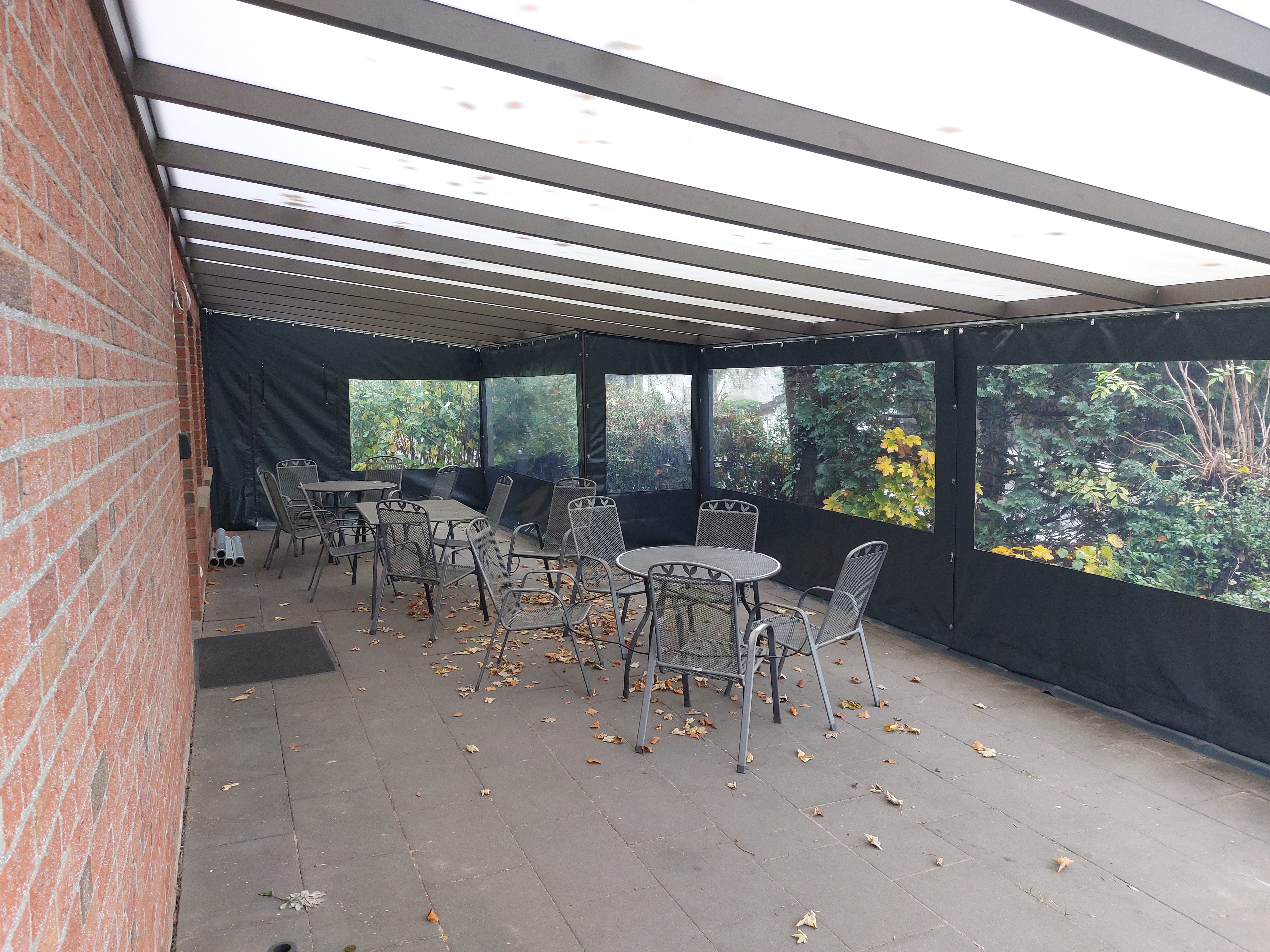 Die komplette Längsseite und die rückwärtige Stirnseite sind nun mit Planen ausgestattet. Die Stirnseite hat eine aufrollbare Türplane, die mit Reißverschlüssen geschlossen werden kann. Große Fensterausschnitte mit transparenten Folien lassen auch im geschlossenen Zustand ausreichend Tageslicht einfallen. Darüber hinaus hängen die Planen an Rollen in Laufschienen, sodass sie, ähnlich wie Gardinen, komplett aufgeschoben werden können, falls dies, z. B. bei warmer Witterung, gewünscht wird.