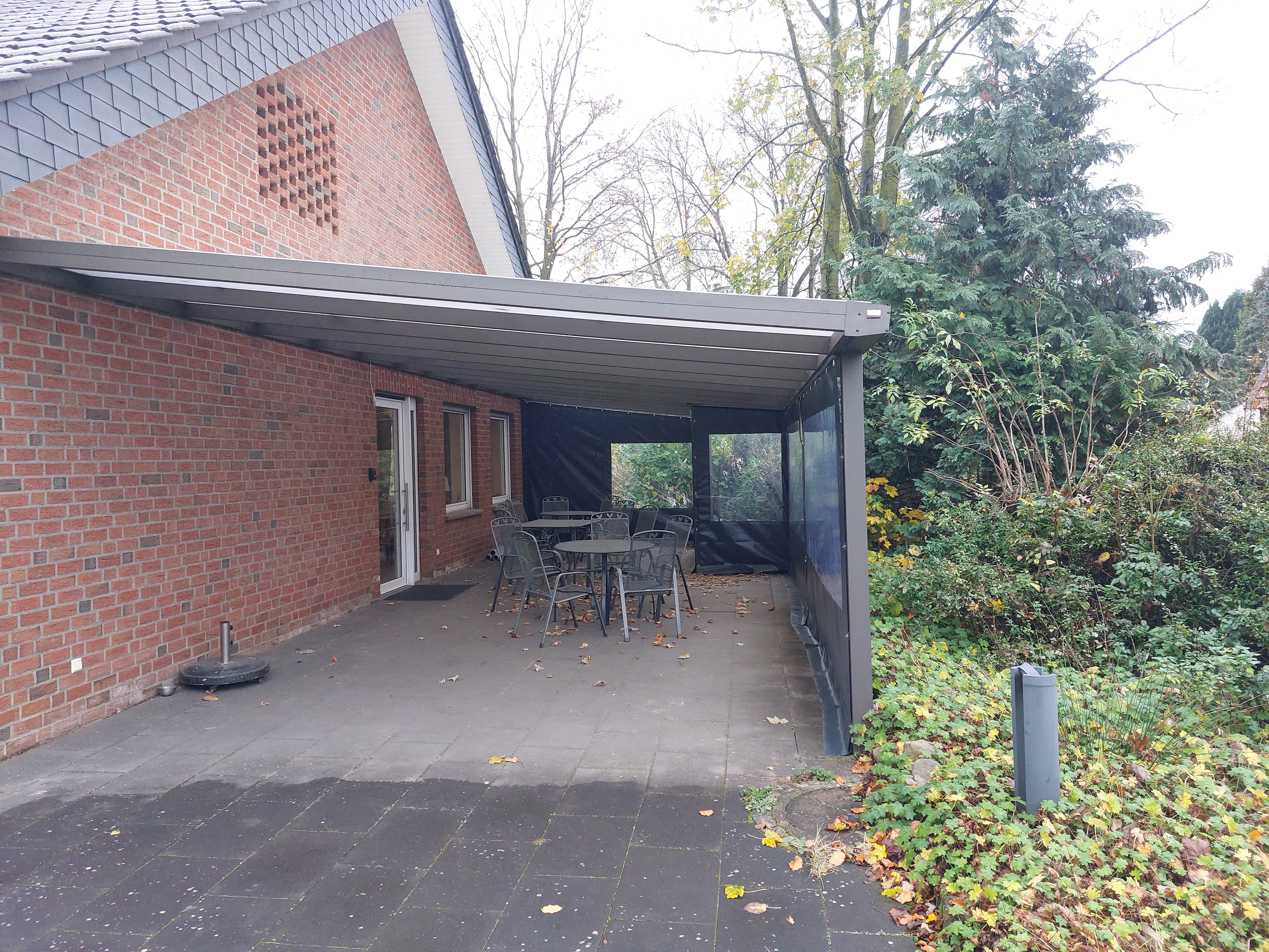 Zurzeit ist die Stirnseite zum Kirchhof noch offen. Um Kosten zu sparen und um es auf der Terrasse nicht zu dunkel werden zu lassen.