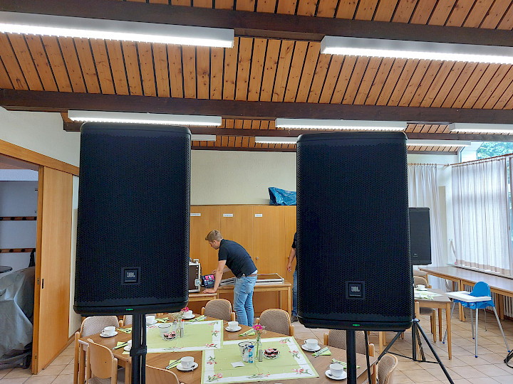 Die große Beschallungsanlage des Interessen-Vereins (► hier) ist kurzentschlossen um zwei weitere Lautsprecher ergänzt worden. Gut 2000 € hat die Anschaffung gekostet, einschließlich der zugehörigen Kabel, Taschen und Stative. Kein Pappenstiel, aber doch vernünftig, denn so können auch größere Veranstaltungen gleichmäßiger beschallt werden. Immer wieder war es zu Beschwerden der Gäste unmittelbar vor den Lautsprechern gekommen, es sei zu laut. Geliefert wurden die Lautsprecher von der Fa. Placke und Kulemann, die seinerzeit auch die Anlage für uns zusammengestellt hatte. So ist die Kompatibilität auf jeden Fall gewährleistet
