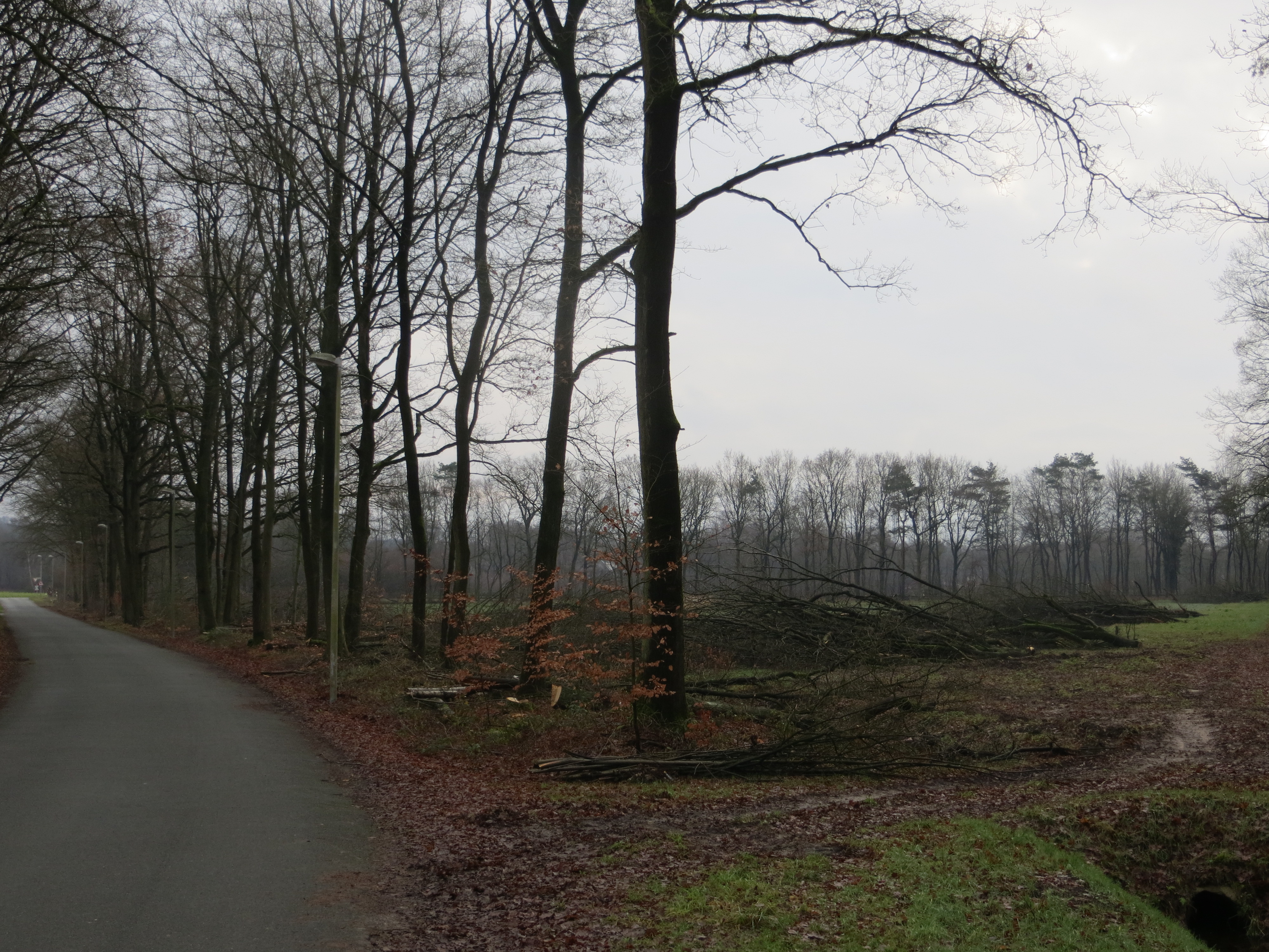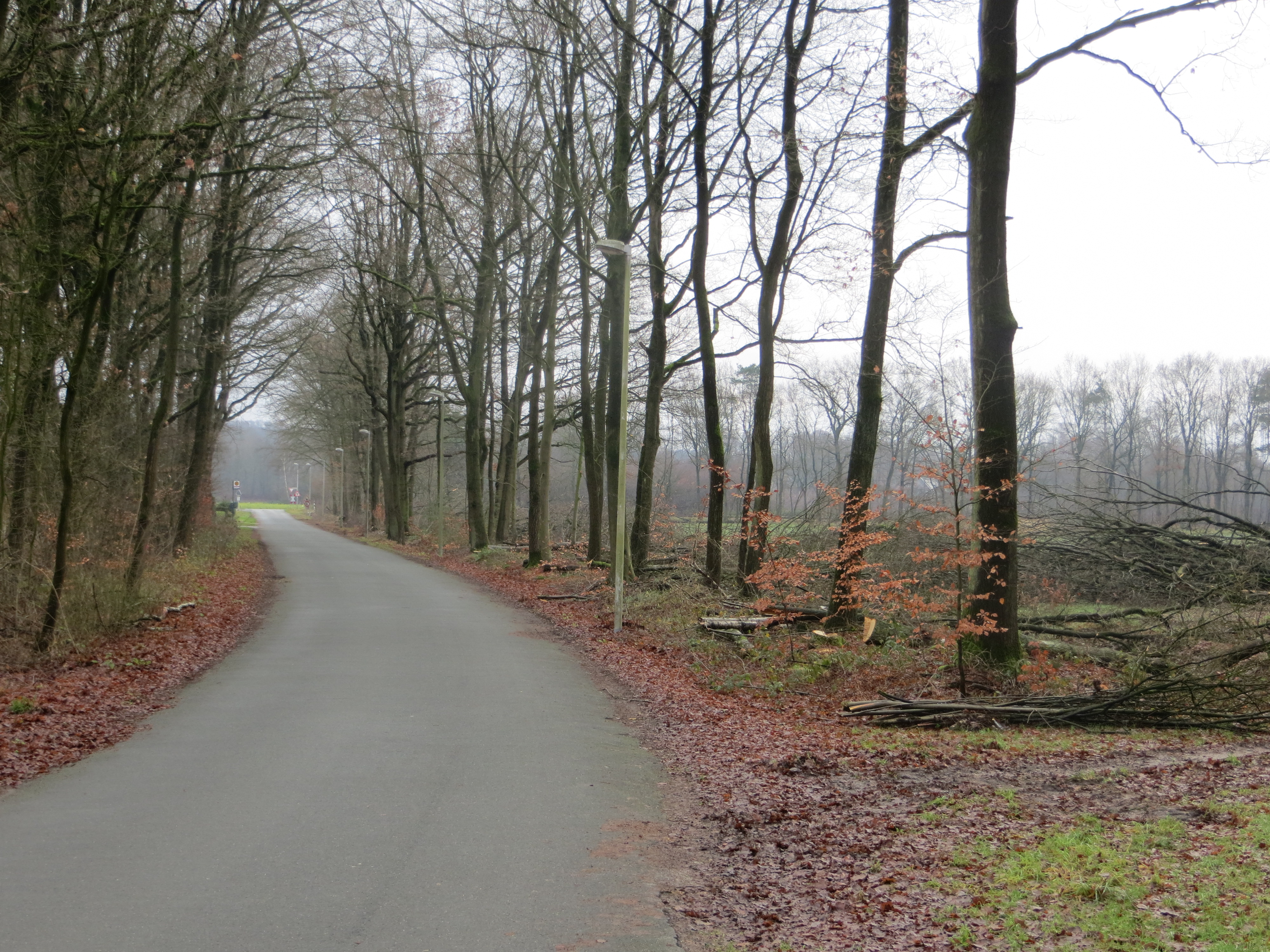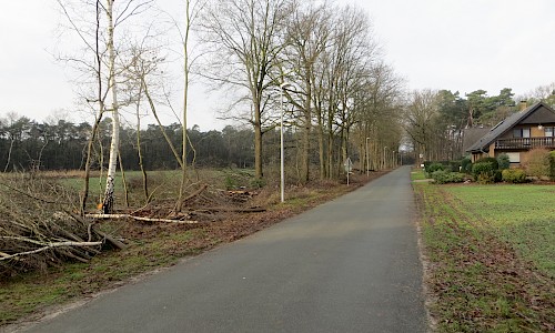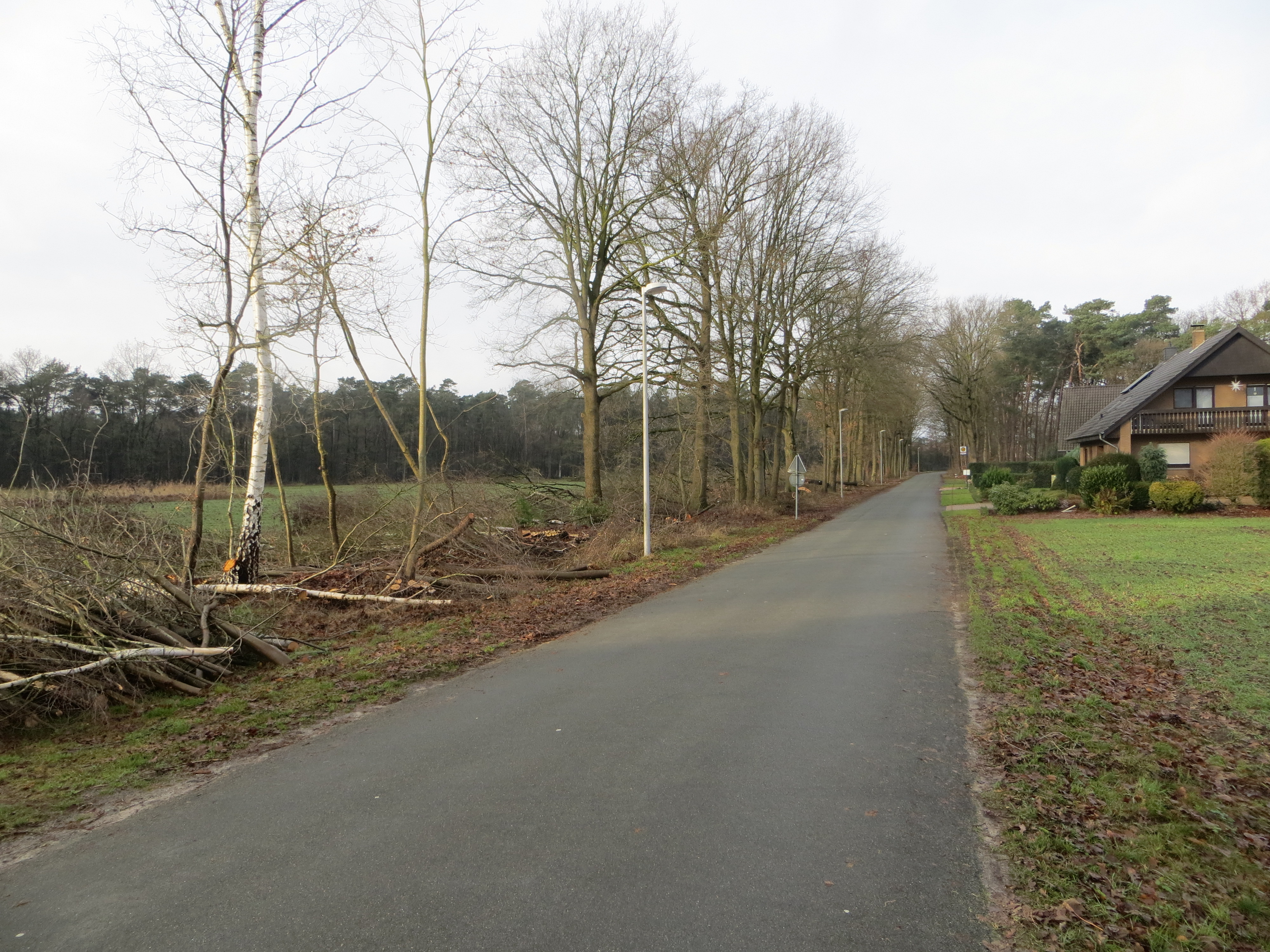 Die Wallhecke westlich der Ostenwalder Str. wurde ind en letzten Jahren immer mehr von größeren Bäumen dominiert und dünnte unten aus. Im Sommer wirkte die Straße Richtung Siedlung am Flüddert wie ein grüner Tunnel.