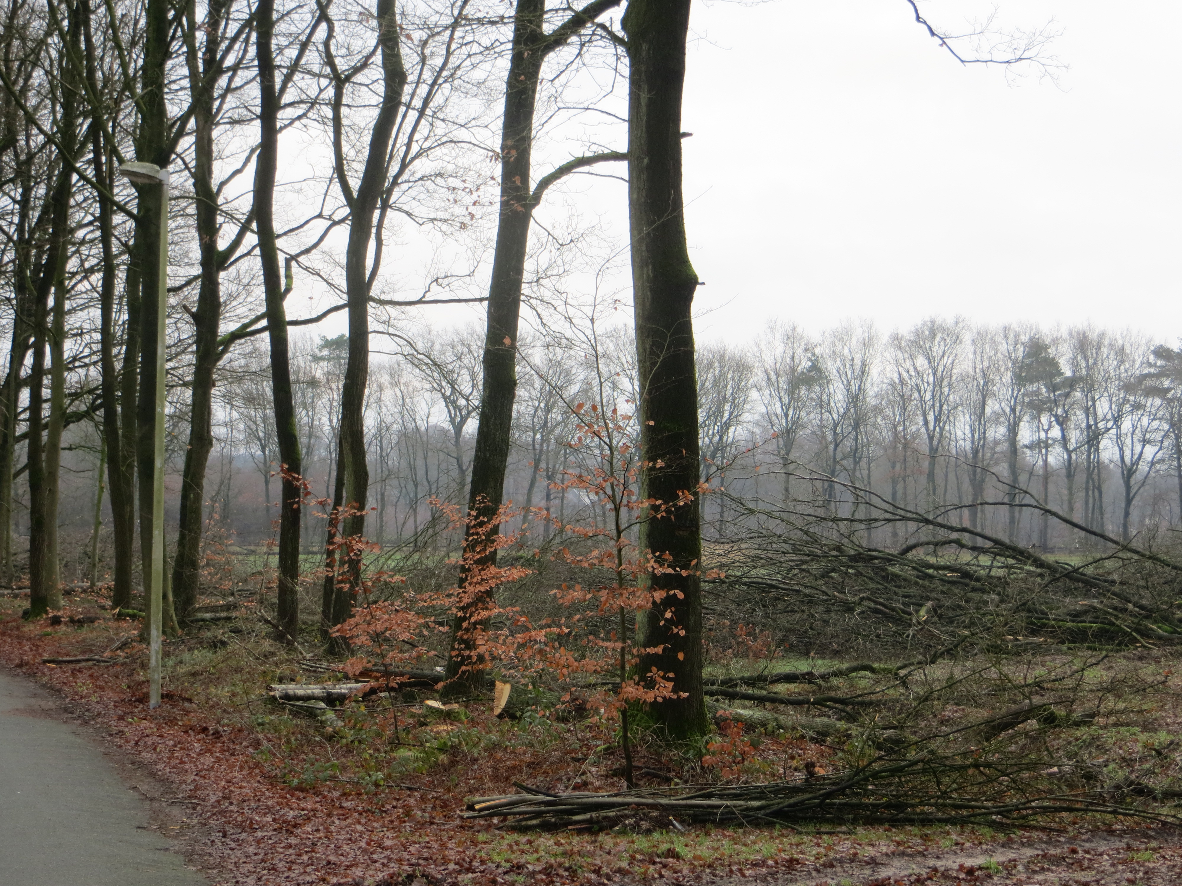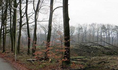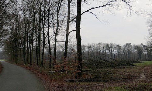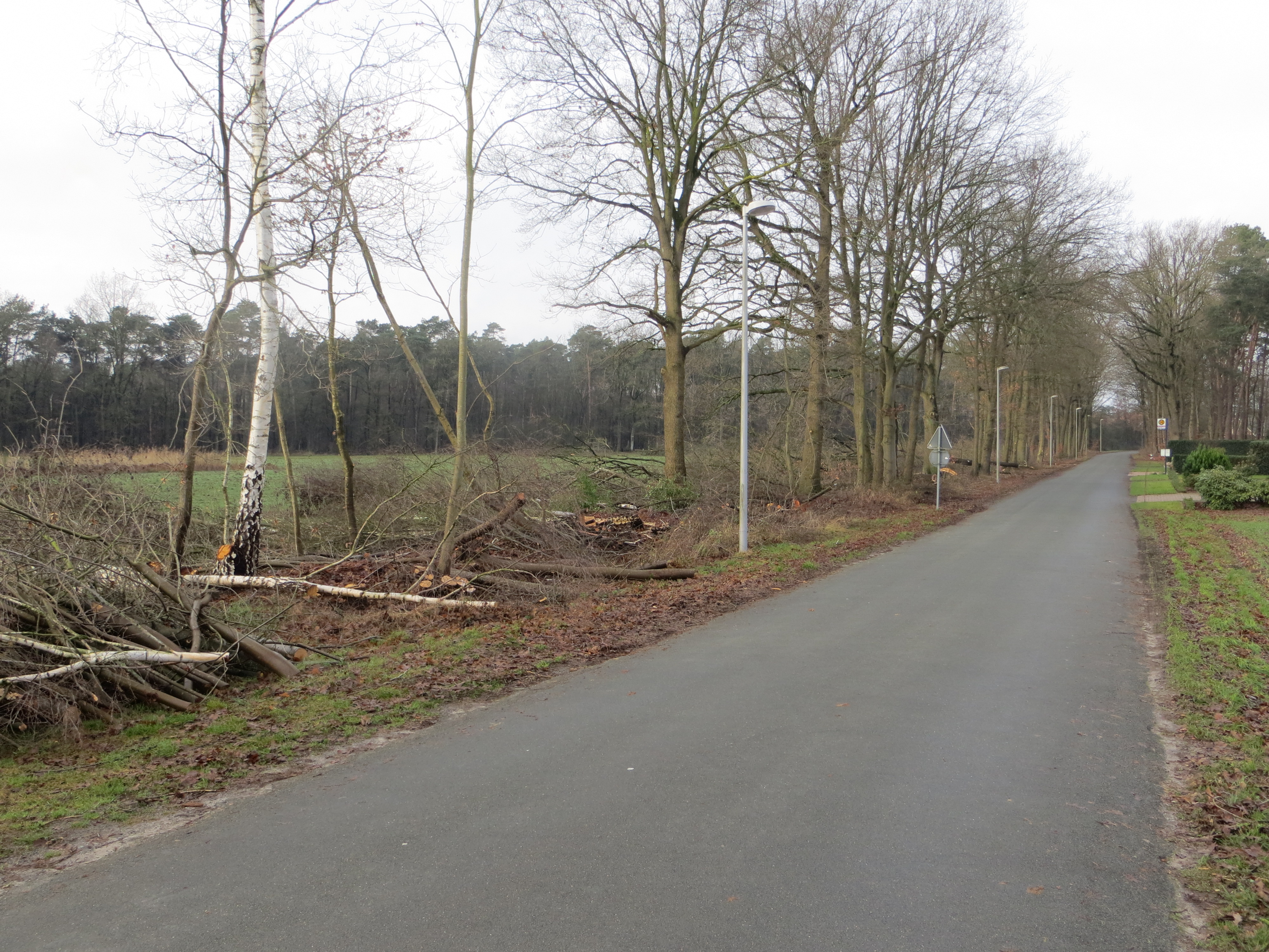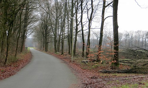 Die Wallhecke westlich der Ostenwalder Str. wurde ind en letzten Jahren immer mehr von größeren Bäumen dominiert und dünnte unten aus. Im Sommer wirkte die Straße Richtung Siedlung am Flüddert wie ein grüner Tunnel.
