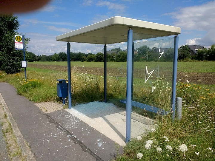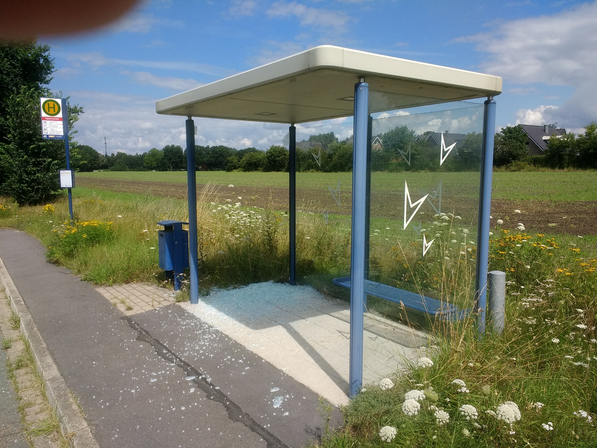 Es ist kaum zu glauben. Anfang Juli hatten wir noch berichtet, dass die Stadt nach langer Wartezeit nun die zerstörten Scheiben an den Bushaltestellen-Wartehäuschen erneuert hat (→hier). Und kaum vier Wochen später schlägt der "Scheibenteufel" nach über 2 Jahren wieder zu.