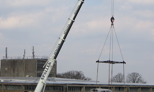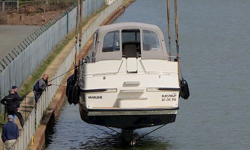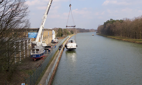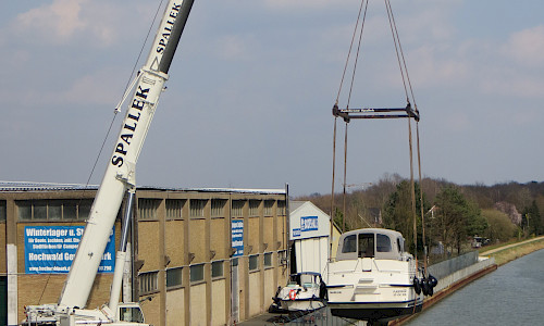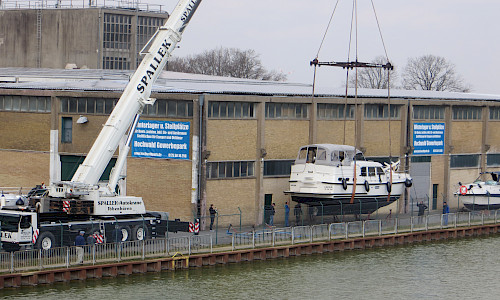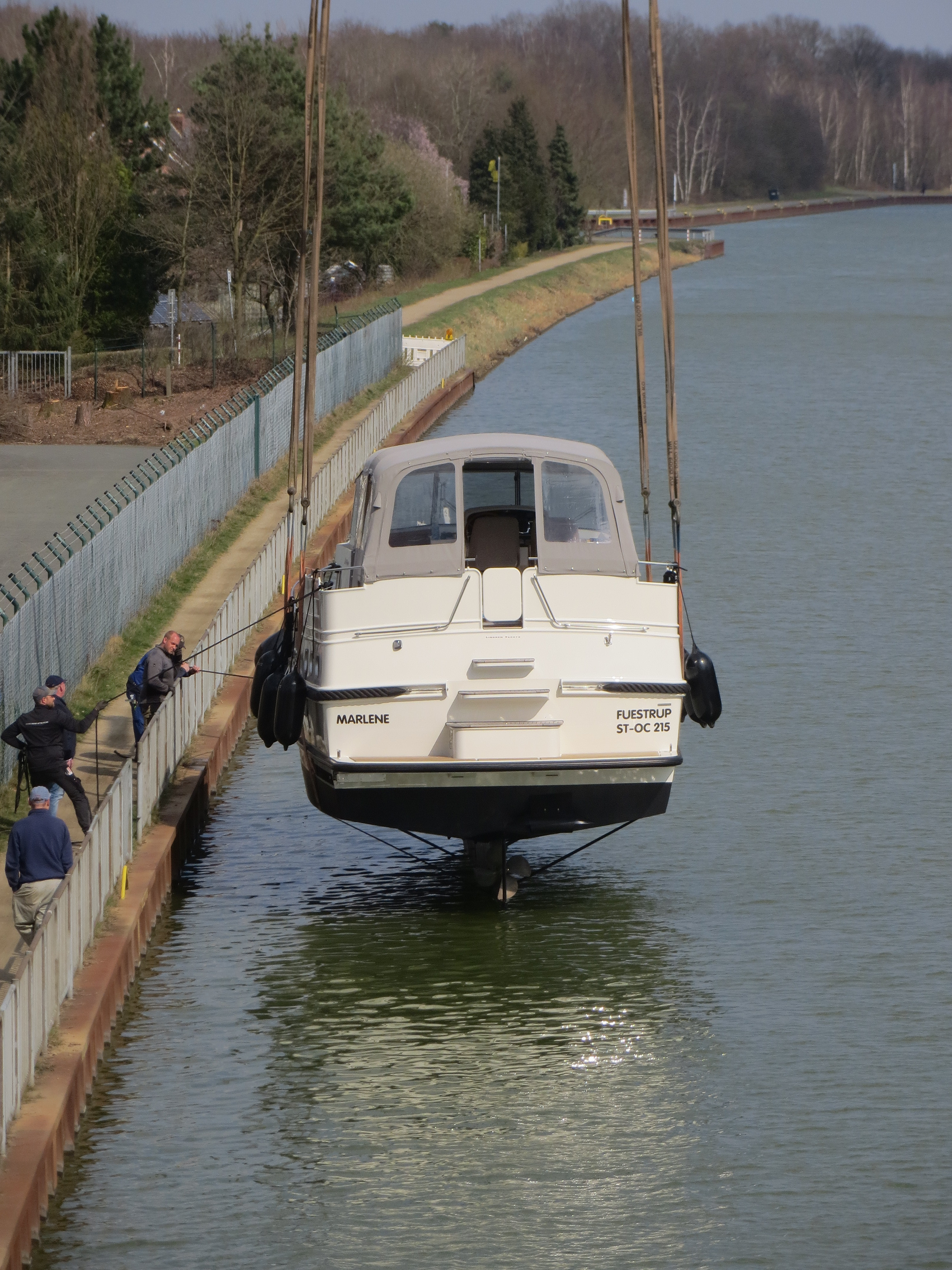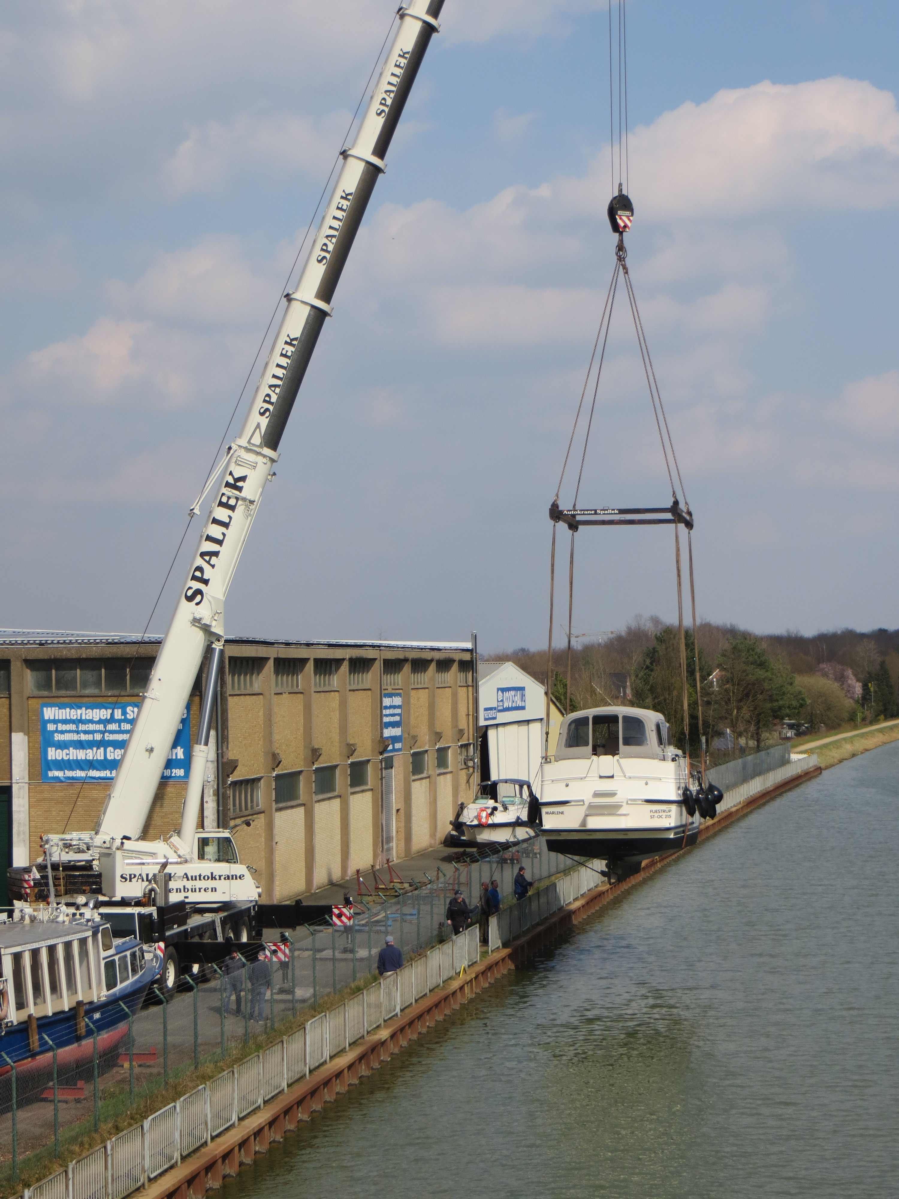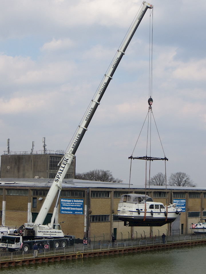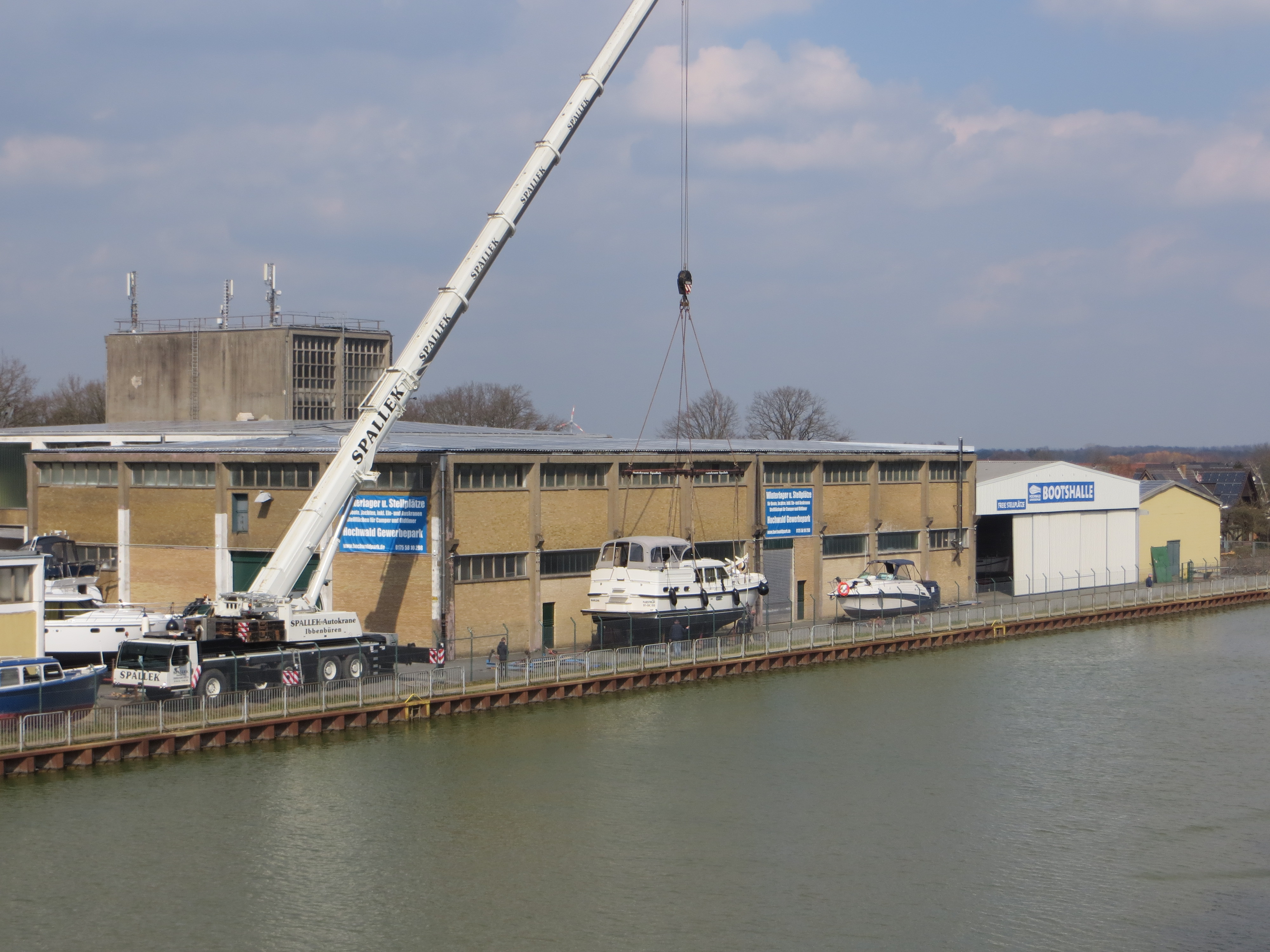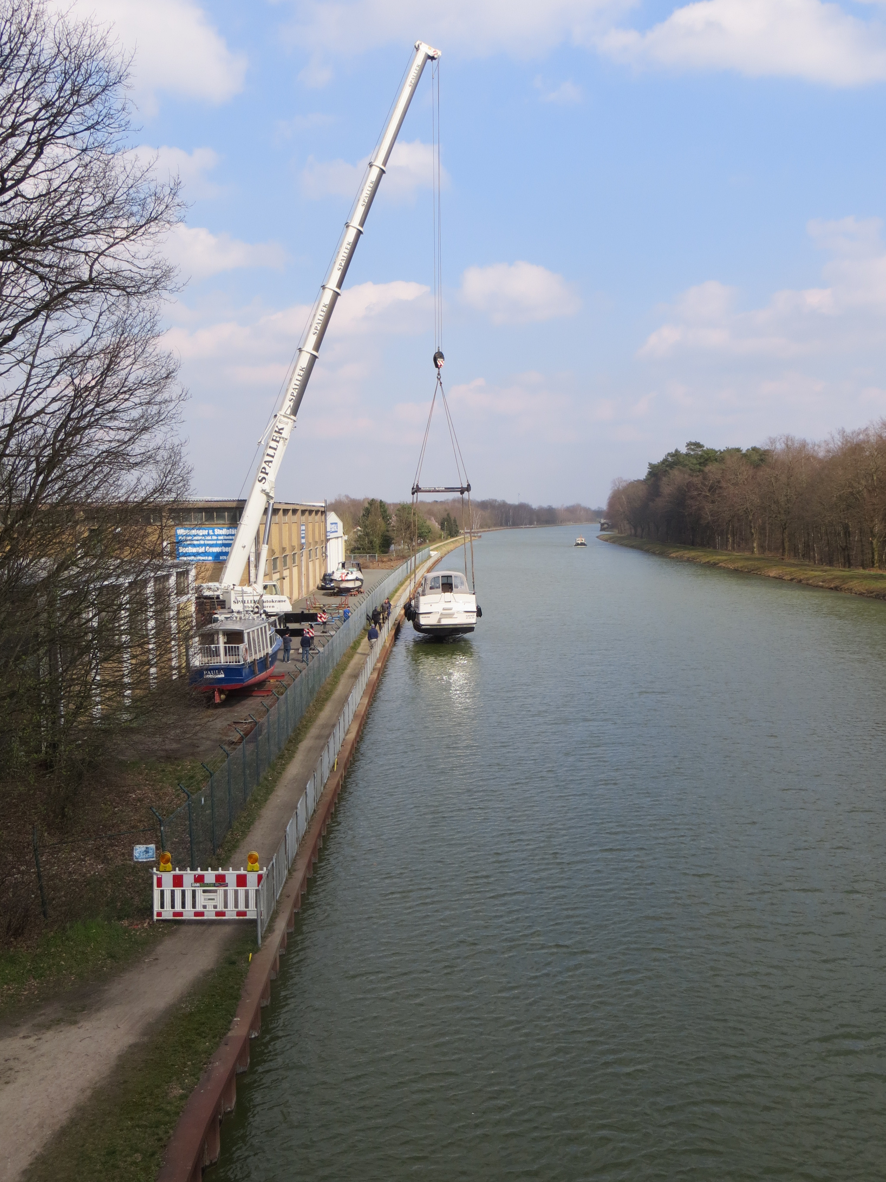 Am Freitag war es wieder so weit. Am frühen Nachmittag ließ der Autokran der Fa. Spallek, der bis 220 Tonnen tragen kann, sechs Boote zu Wasser. 16 Tonnen wog das schwerste. Für den Kran eine Kleinigkeit. Aufpassen muss der Kranführer, damit das Boot in den Gurten am Haken nirgendwo anstößt, insbesondere bei Seitenwind. An langen Seilen wurde das Boot vom „Bodenpersonal“ geführt, als es in einer fließenden Bewegung hoch, über den Zaun und in den Kanal ging, der direkt neben den Hallen verläuft. Der Leinpfad war während der Aktion für Radfahrer und Fußgänger gesperrt. In den nächsten Wochen wird es wohl mit den anderen Booten weitergehen.