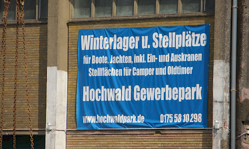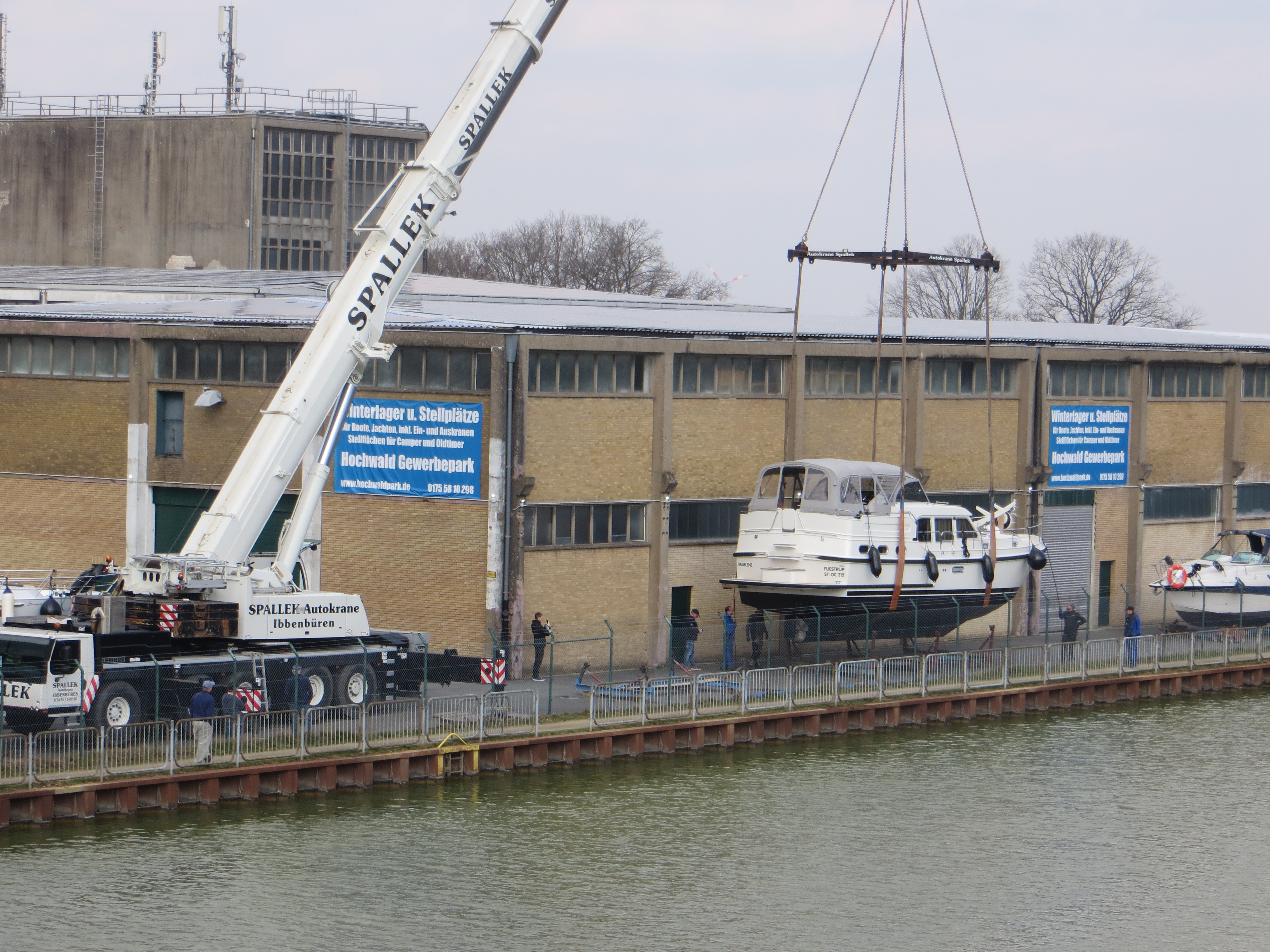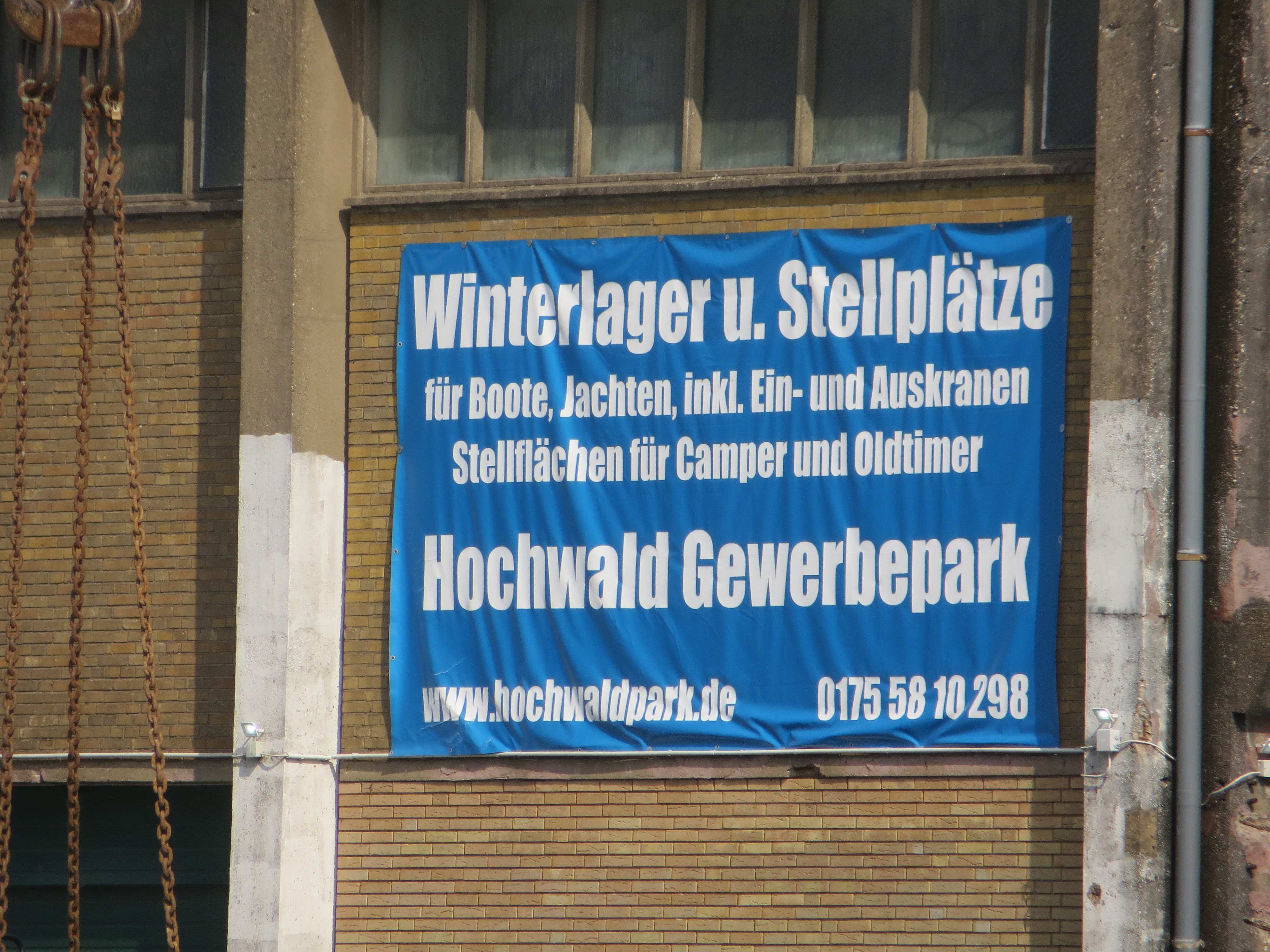 Direkt an der Uffelner Grenze zu Obersteinbeck liegen die Hochwald-Hallen. Früher Industriehallen, heute Gewerbehallen, in denen man Boote, Wohnwagen, Wohnmobile pp. unterstellen kann. Ungefähr 50 Boote überwintern dort auf dem Gelände. Und da die Hallen keinen eigenen Hafen mit fester Krananlage haben, kommt im Frühjahr immer der Autokran, um die Boote zu Wasser zu lassen.