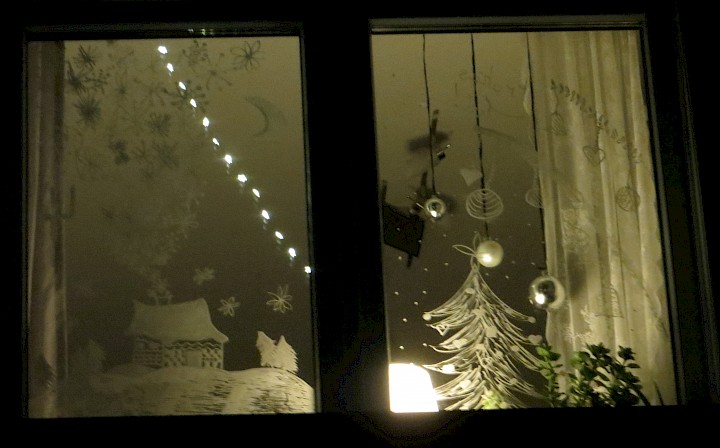 Kleines Fenster neben der Eingangstür. Dekoriert mit handgemalten Bildern mit adventlichen Motiven. Man kann direkt an das Fenster herantreten.
