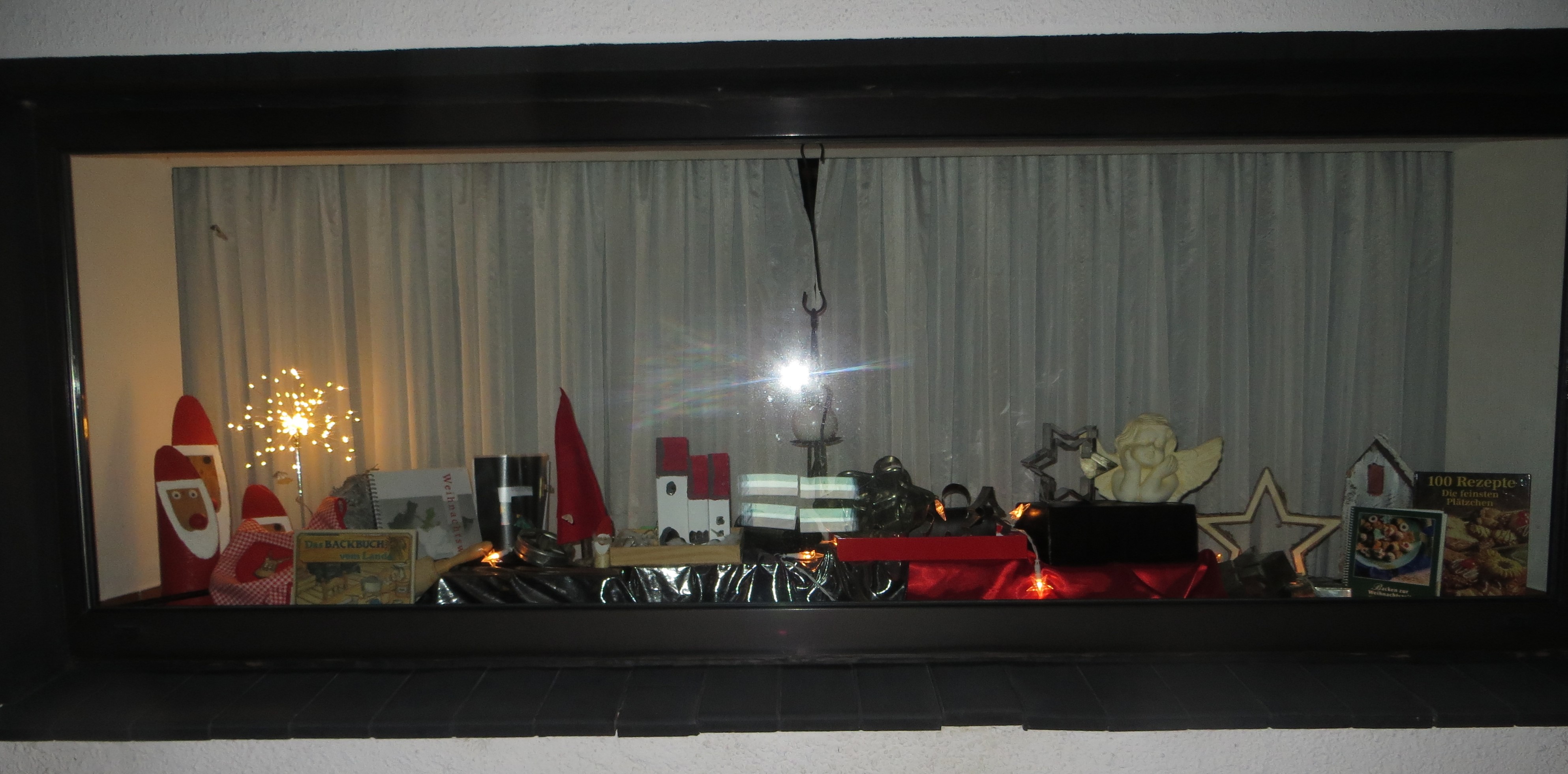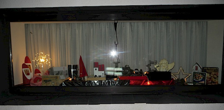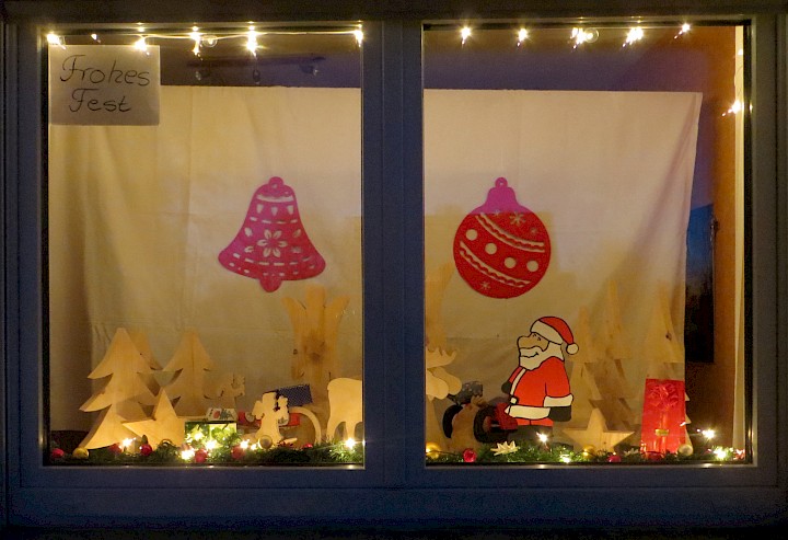 Das Fenster ist an der Straßenseite. Man kann bis direkt an das Fenster herantreten. Es steht unter dem Motto "Weihnachtsbäckerei" und zeigt Ausstechformen und Backbücher