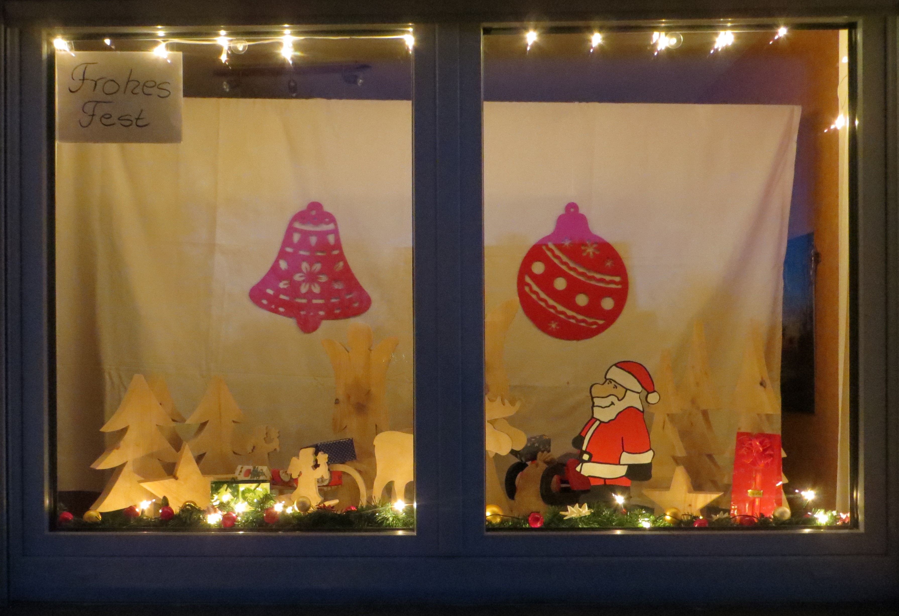 Fenster im Erdgeschoss zur Straßenseite. Man kann direkt an das Fenster herantreten. Der Weihnachtsmann hat auf der Fensterbank eine Dose mit Süßigkeiten abgestellt, aus der Besucher sich bedienen können.