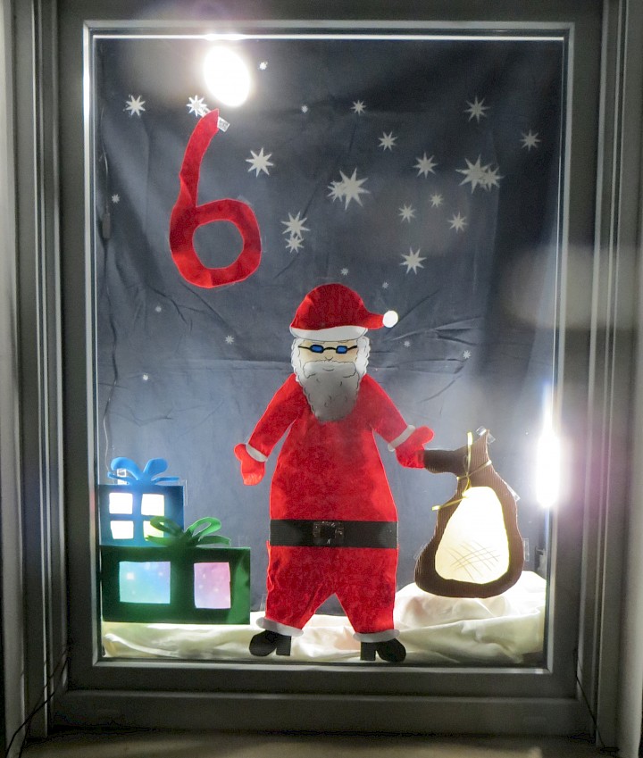 Fenster neben der Eingangstür, von der Straße aus zu sehen. Passend zum Nikolaustag dekoriert. Großer Nikolaus mit Sack und Geschenken. Dazu passende leise Musikuntermalung aus einer Box unter dem Fenster.
