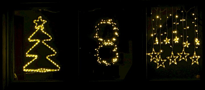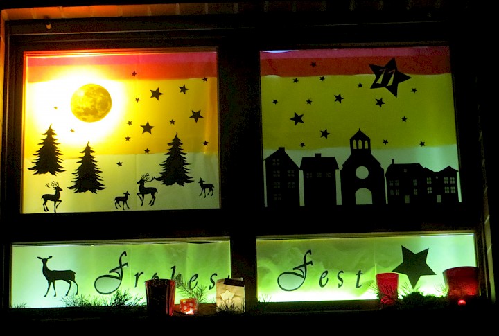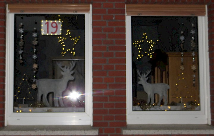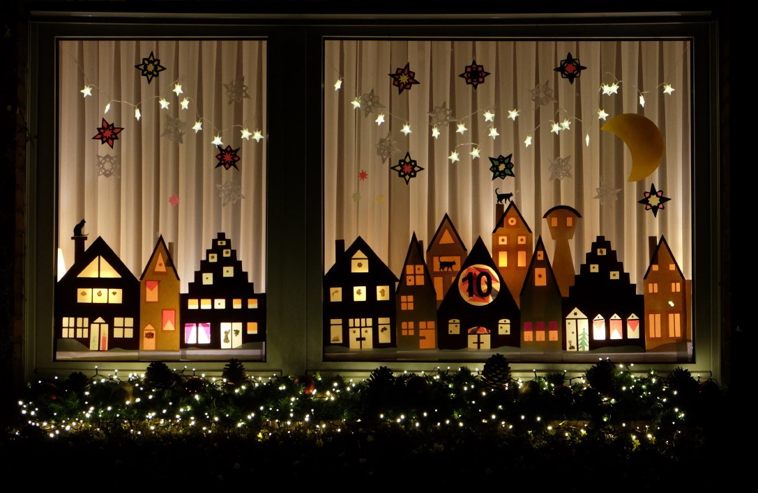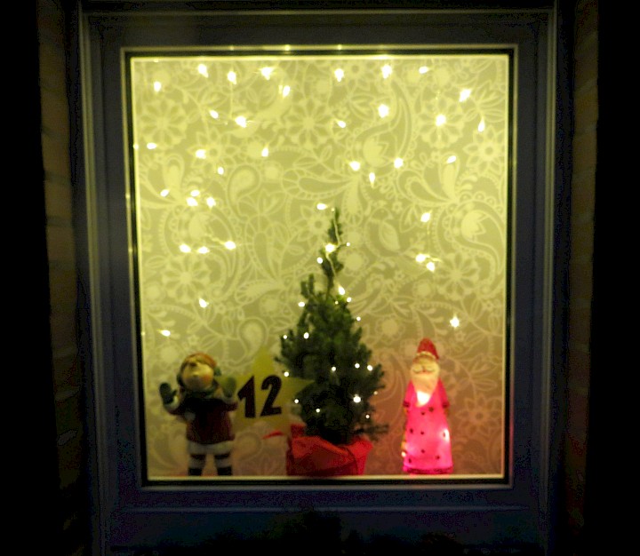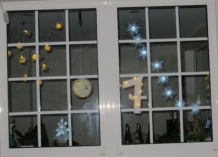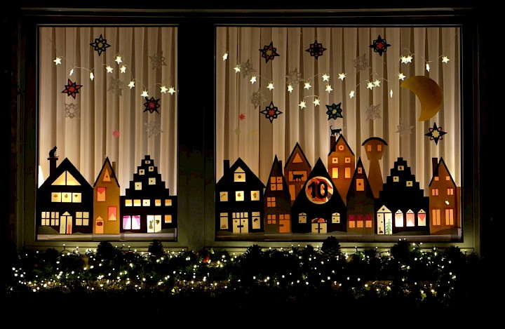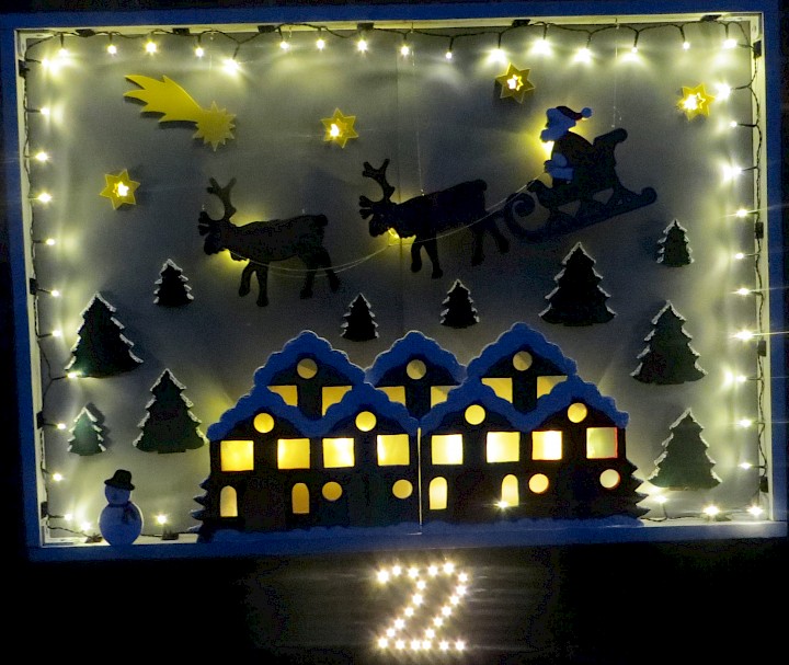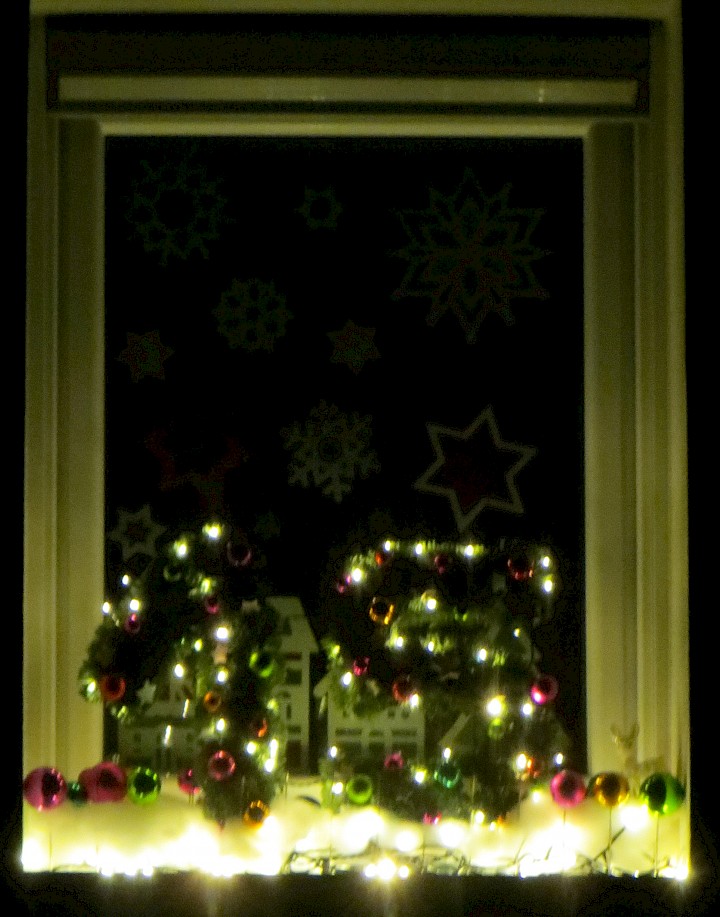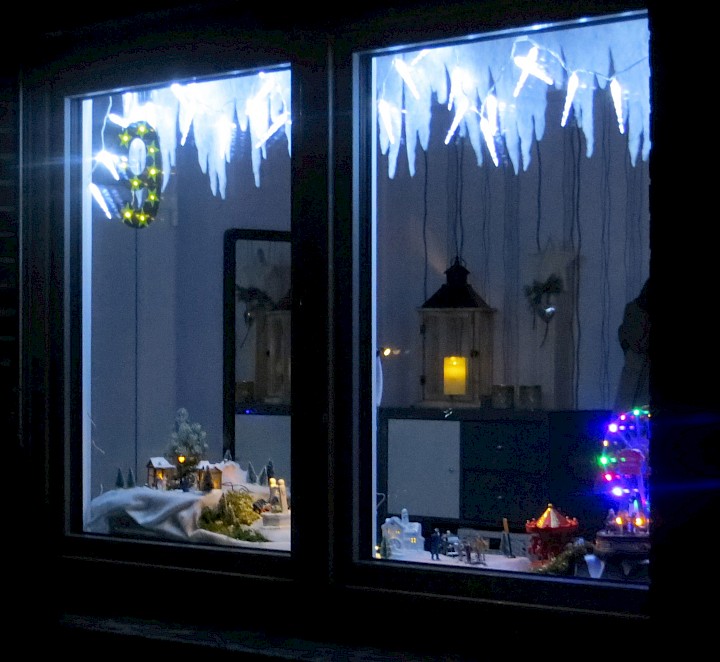 Das Fenster ist von der Straße aus gut zu sehen. Es zeigt eine Häuserzeile unter einem Sternenhimmel. Aus Hintergrund ertönt leise Weihnachtsmusik. Eine Lichterkette auf der Fensterbank und der blühende Winterjasmin rahmen das Fenster ein.