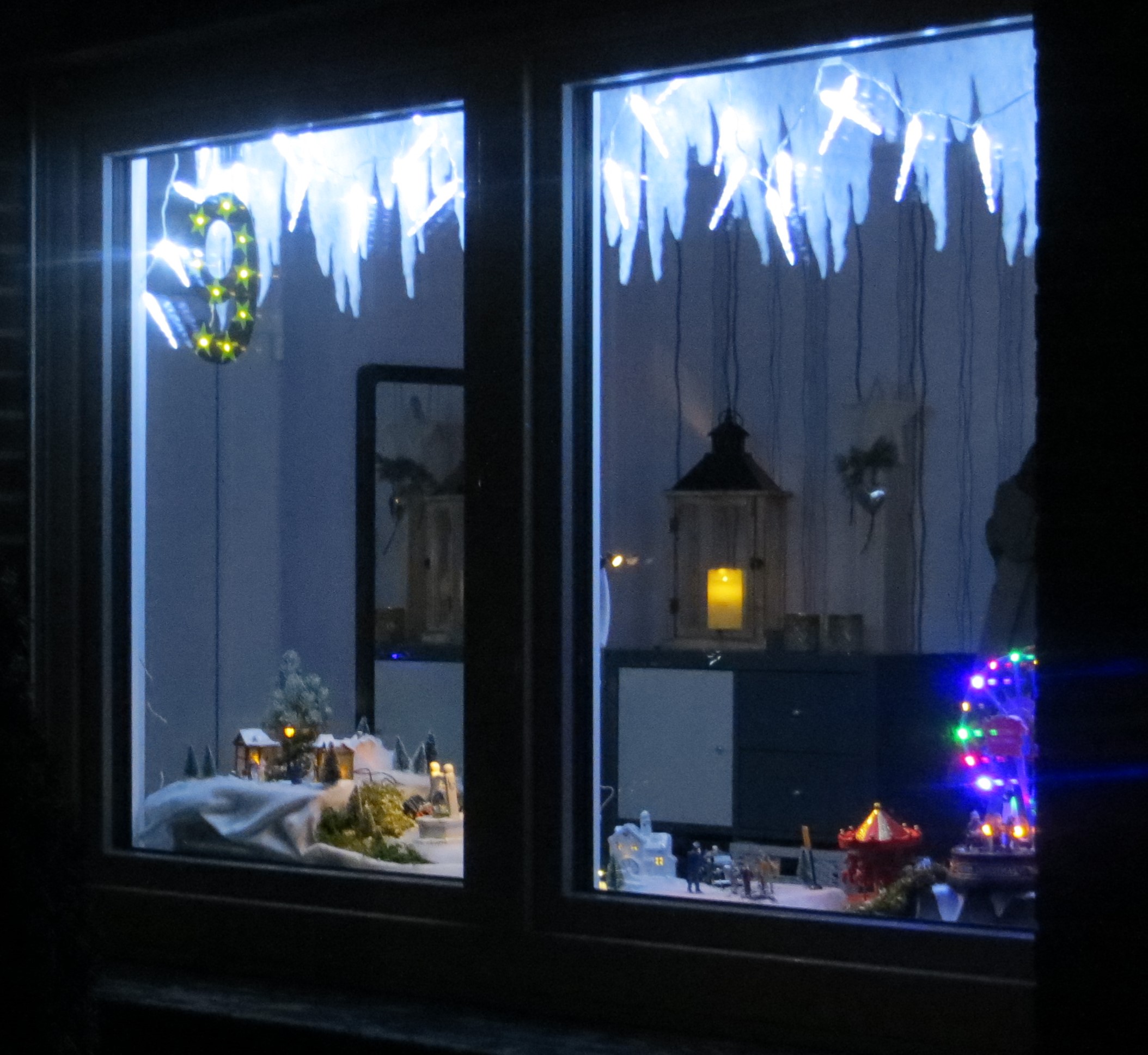 Fenster zur Straßenseite. Leider schränkt ein Strauch im Vorgarten die frontale Sicht von der Straße auf das Fenster etwas ein. Man kann jedoch ganz nah herantreten und die Winterlandschaft mit kleinen Häuschen und Figuren sowie einem sich drehenden Riesenrad betrachten. Neben dem Fenster ist auch der Hauseingang dekoriert.