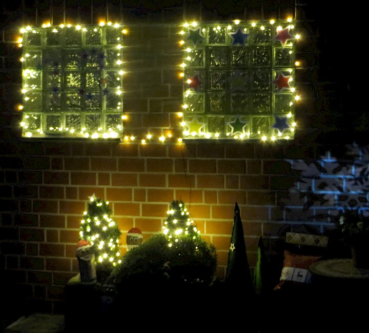 Fenster mit Glasbausteinen auf der Straßenseite des Stalls, dekoriert mit Lichterketten und bunten Sternen.
