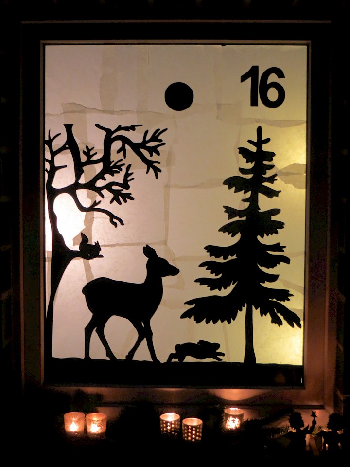 Fenster im Dachgiebel zur Straße, Scherenschnitte (Tiere, Bäume, Häuser) unter einem Sternenhimmel mit großem Mond; Frohes Fest