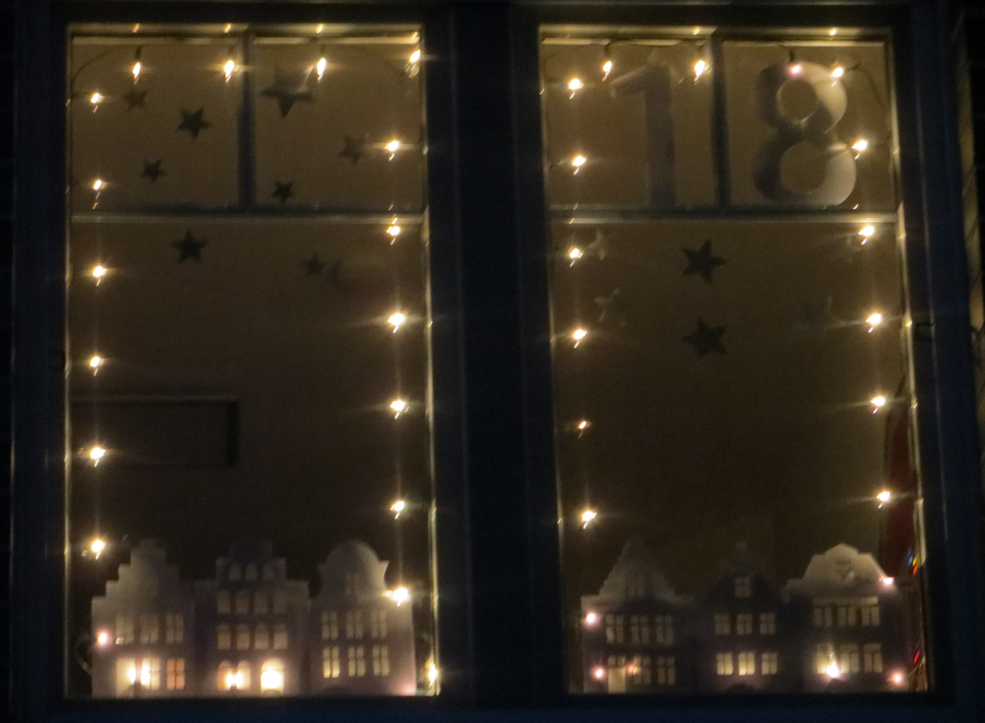 Kleines Fenster im 1. Stock über dem Hauseingang, von der Straße aus gut zu sehen. Beleuchtete "15" mit Häusern und Sternen im Hintergrund.