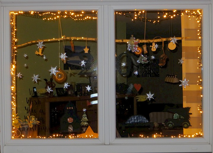 Fenster im Ergeschoss zur Straßenseite; 'We wish you a Merry Christmas' mit Lichterkette, Sternen pp..