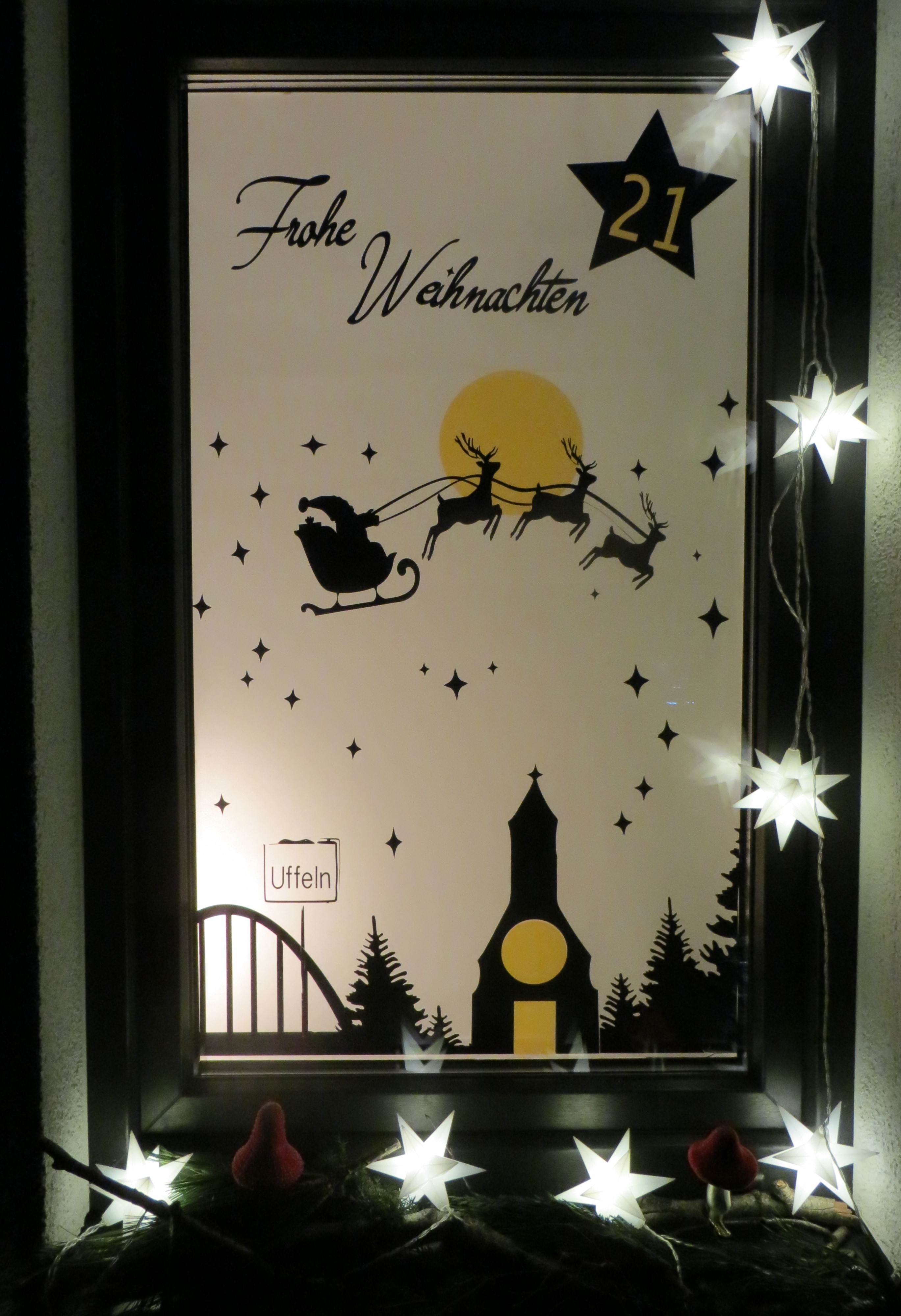 Kleines Fenster zur Straßenseite. Man kann dicht herantreten. Das Fenster zeigt den Weihnachtsmann im Rentierschlitten am Uffelner Nachthimmel. Frohe Weihnachten