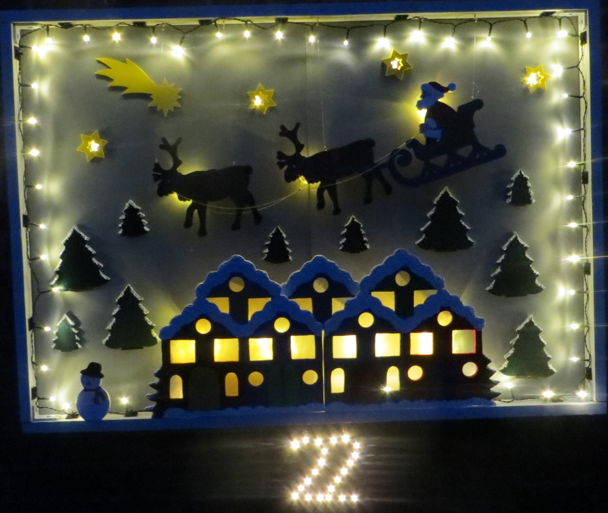 Heute mal kein geschmücktes Fenster, sondern eine beleuchtete, gerahmte Holztafel, die an der Stallwand zur Straßenseite aufgehängt ist. Gemeinschaftsprojekt der Familie Schröer. Bemalte Laubsägearbeiten zeigen den Weihnachtsmann im Rentierschlitten, eine Häuserzeile und Bäume. Darunter auf einer Holzbank steht eine Dose mit Süßigkeiten, an der sich der geneigte Betrachter bedienen darf.