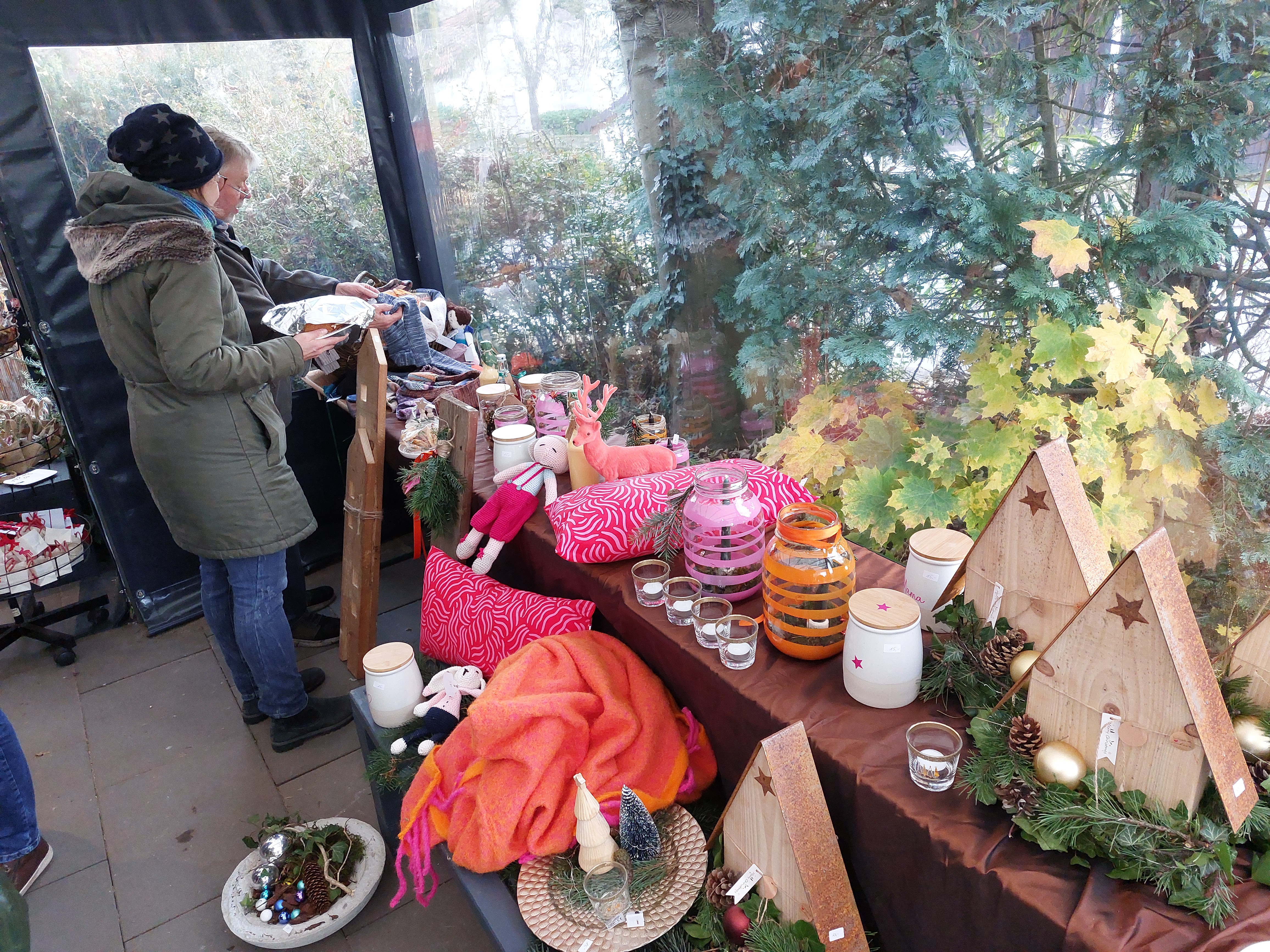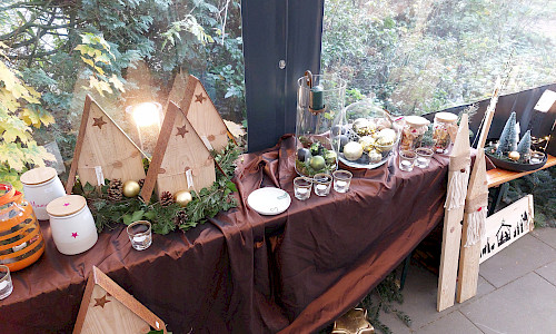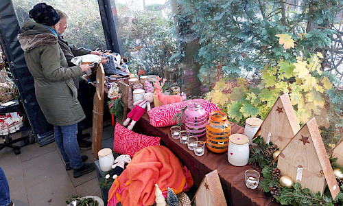 Der gemütliche Teil des Basars fand aber auf der Terrasse statt. Zwischen den Ausstellungstischen drängten sich die Besuchergruppen an den Stehtischen und schlürften ihren heißen Glühwein. Bei diesen Temperaturen der Renner. Die Geschäfte liefen gut, hatte man den Eindruck.