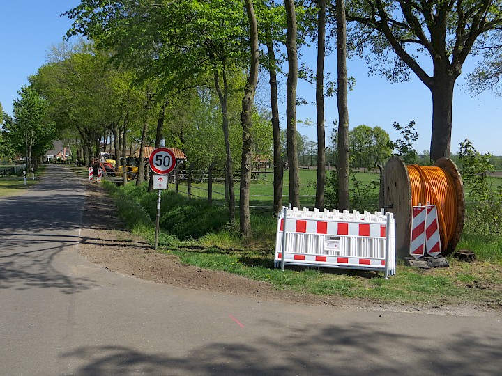 Viele Uffelner, die auf dem Uffelner Esch oder sonst im Außenbereich von Uffeln wohnen, warten drauf. In Hopsten, Hörstel und Recke läuft die Sache bereits. Direkt an der Grenze zu Uffeln wird in den Außenbereichen der Gemeinde Hopsten und der Stadt Hörstel Glasfaser verlegt. Auf dem Foto sind die Arbeiten an der Uffelner Str., Verlängerung der Ostenwalder Str. in Uffeln zu sehen.