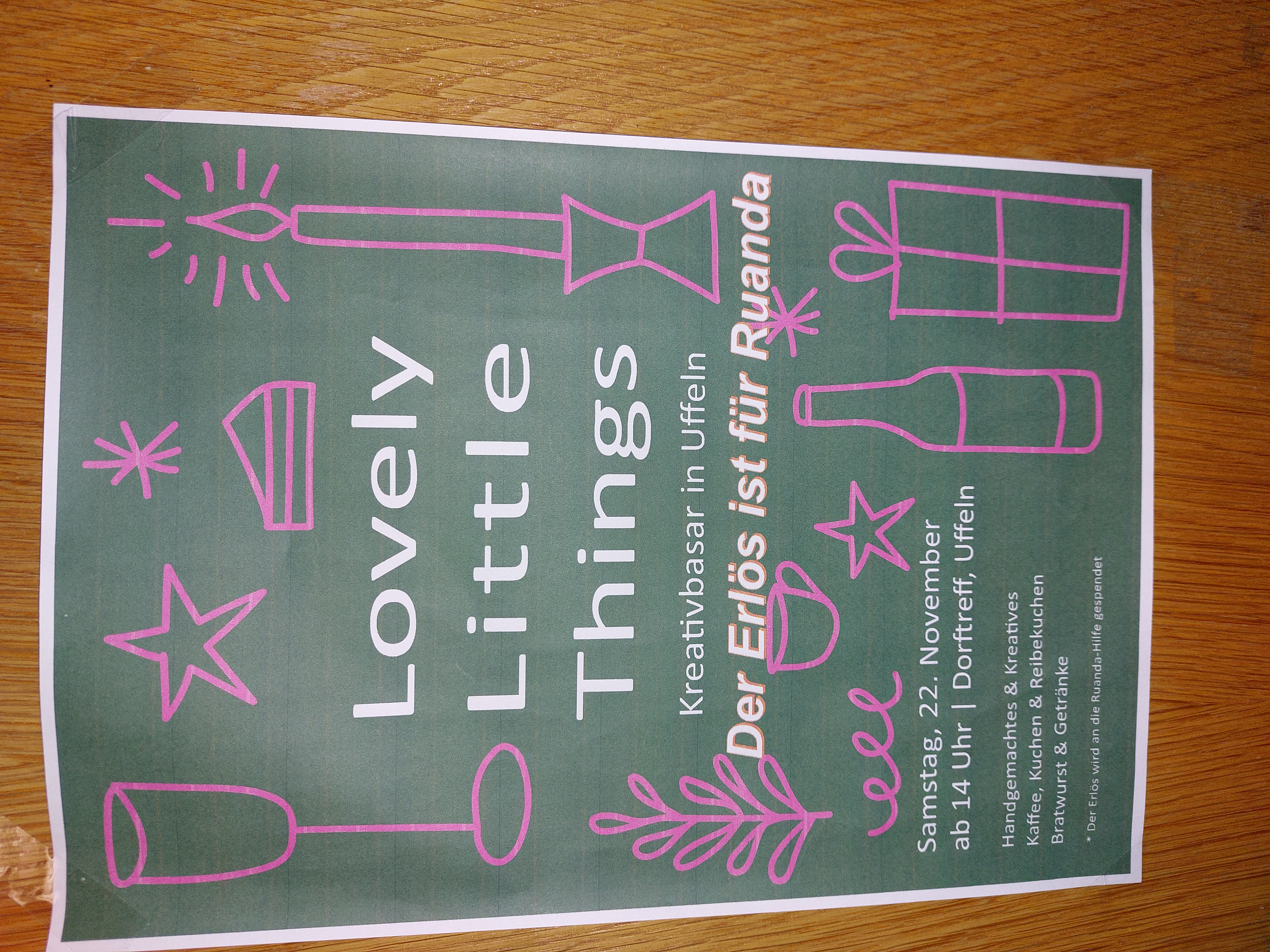 Unter dem Motto „Lovely Little Things“ wird viel Handgemachtes & Kreatives angeboten. Und natürlich ist auch für das leibliche Wohl gesorgt. Aus den Nachbarschaften in Uffeln wurde selbstgemachter Kuchen gespendet, der im Dorftreff sicher für viel Gaumenfreude bei den Kuchenliebhabern sorgen wird.