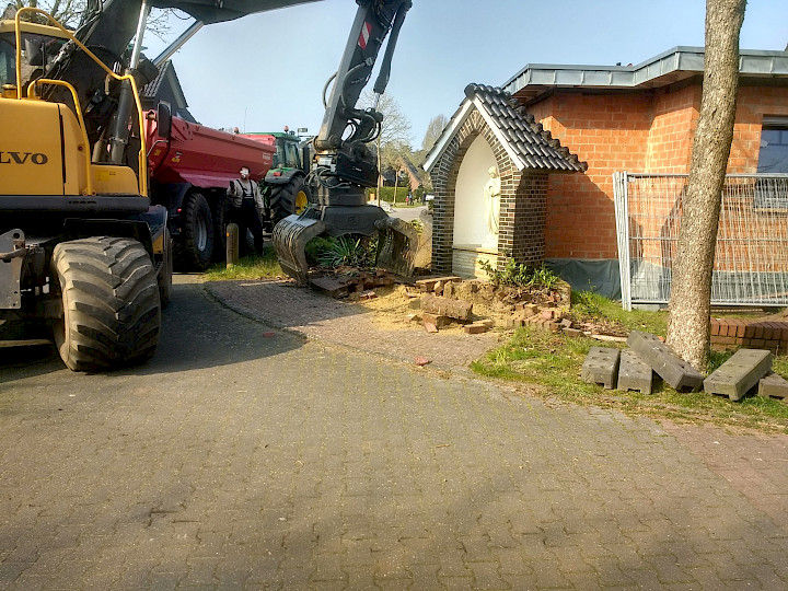 Als in der letzten Woche der Bagger anrückte glaubte der ein oder andere in der Siedlung "Am Flüddert", es habe die letzte Stunde der Muttergottes geschlagen. Aber schnell klärte sich der Irrtum auf. Lediglich die Umgrenzungsmauer des Grundstückes, auf dem die Muttergottes steht, wurde abgerissen.
