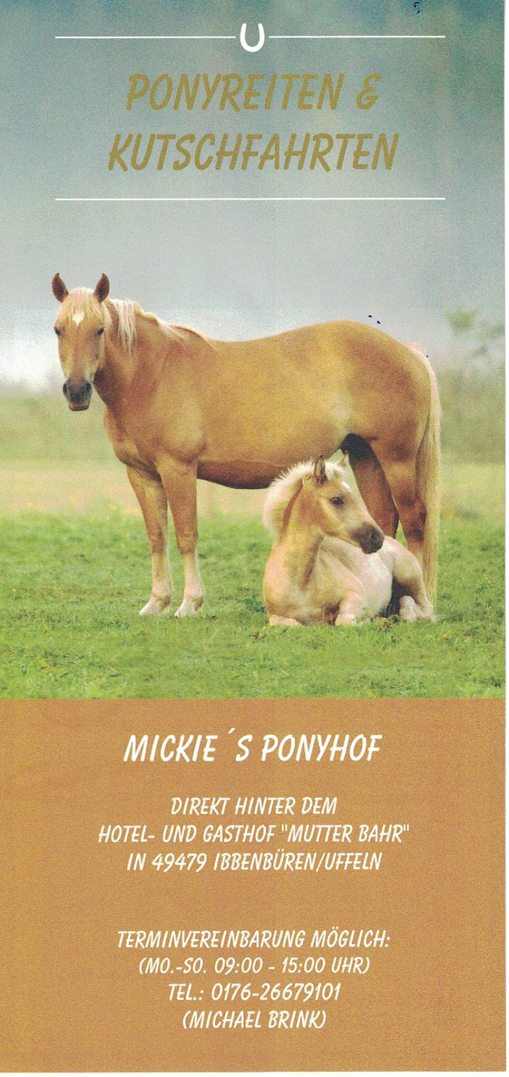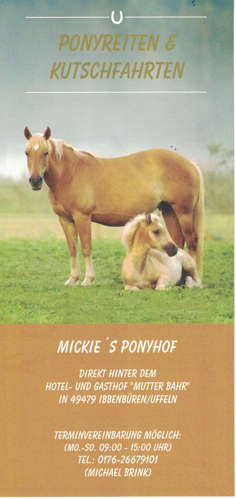 Das Hobby zum Beruf machen, wer möchte das nicht. Michael Brink hat sich seinen Traum erfüllt. Er hat von Heinz Bahr den Pferdestall direkt hinter dem Anwesen „Mutter Bahr“ gepachtet und dort seinen kleinen Ponyhof aufgemacht. Gebaut wurde der Stall im Jahr 2002 und war gedacht für Übernachtungsgäste mit Pferden des Hotels „Mutter Bahr“. In den letzten Jahren stand der Stall aber leer.