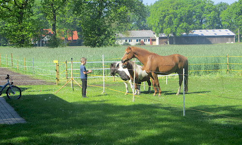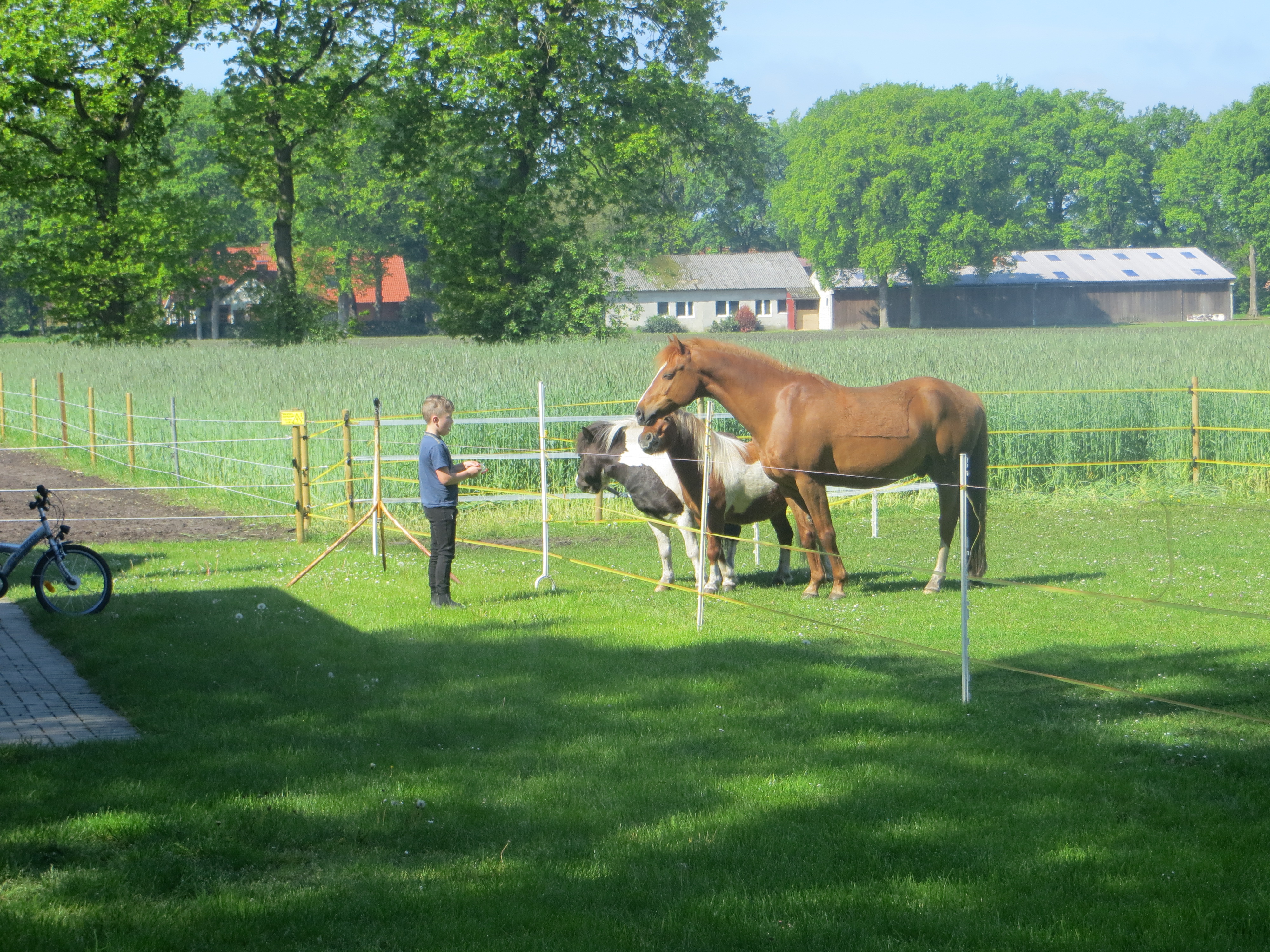 Zum Ponyhof gehören auch Weideflächen und ein eingezäunter, grasloser Reitbereich, der Paddock, in dem die Pferde bewegt werden können.