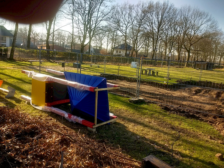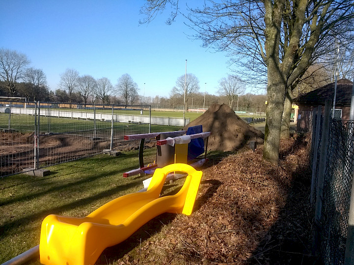 Wenn es gut läuft, wird der kleine Spielplatz im Nordbahn-Stadion noch in diesem Monat fertig. Die Geräte liegen bereit und die Grube für den Fallschutz-Kies ist bereits ausgehoben.