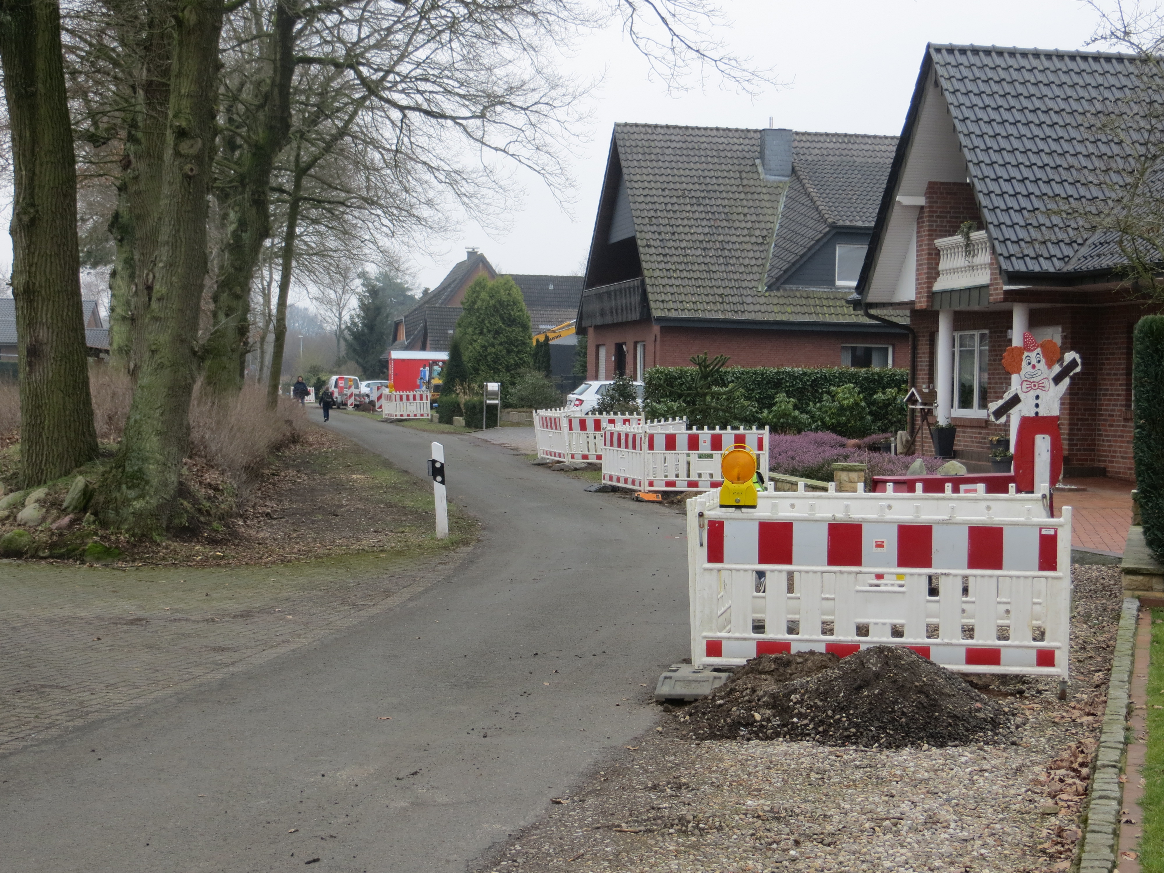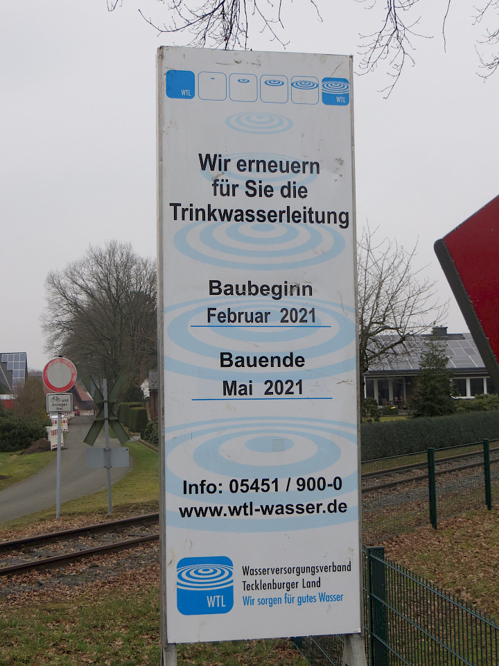 Die Maßnahme des Wasserversorgungsverbandes Tecklenburger Land (WTL) ist schon etwas aufwändiger. Laut Baustellenschild dauern sie von Februar bis Mai. Februar, weil eigentlich schon etwas früher angefangen werden sollte. Aber man brauchte eine Genehmigung für die Unterquerung der Tecklenburger Nordbahn, und die ließ auf sich warten. Daher Baubeginn erst im März. Mai wird es also sicherlich werden.