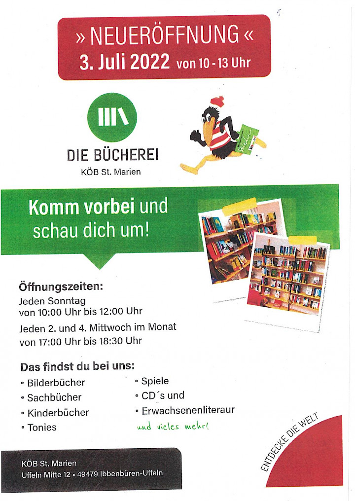 Mit den neuen Öffnungszeiten -siehe Flyer zur Neueröffnung-, der neuen Ausstattung sowie dem erweiterten Medienangebot sind die besten Voraussetzungen für eine weitere positive Entwicklung geschaffen.