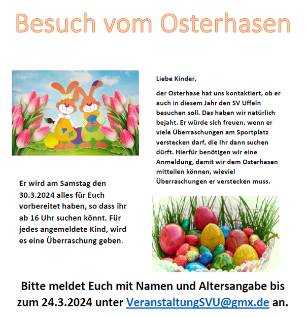 Auch in diesem Jahr besucht der Osterhase wieder den SV Uffeln. Er wird am Samstag, dem 30.3.2024, viele Überraschungen auf dem Sportplatz verstecken.Kinder, die mitsuchen möchten, müssen sich anmelden.