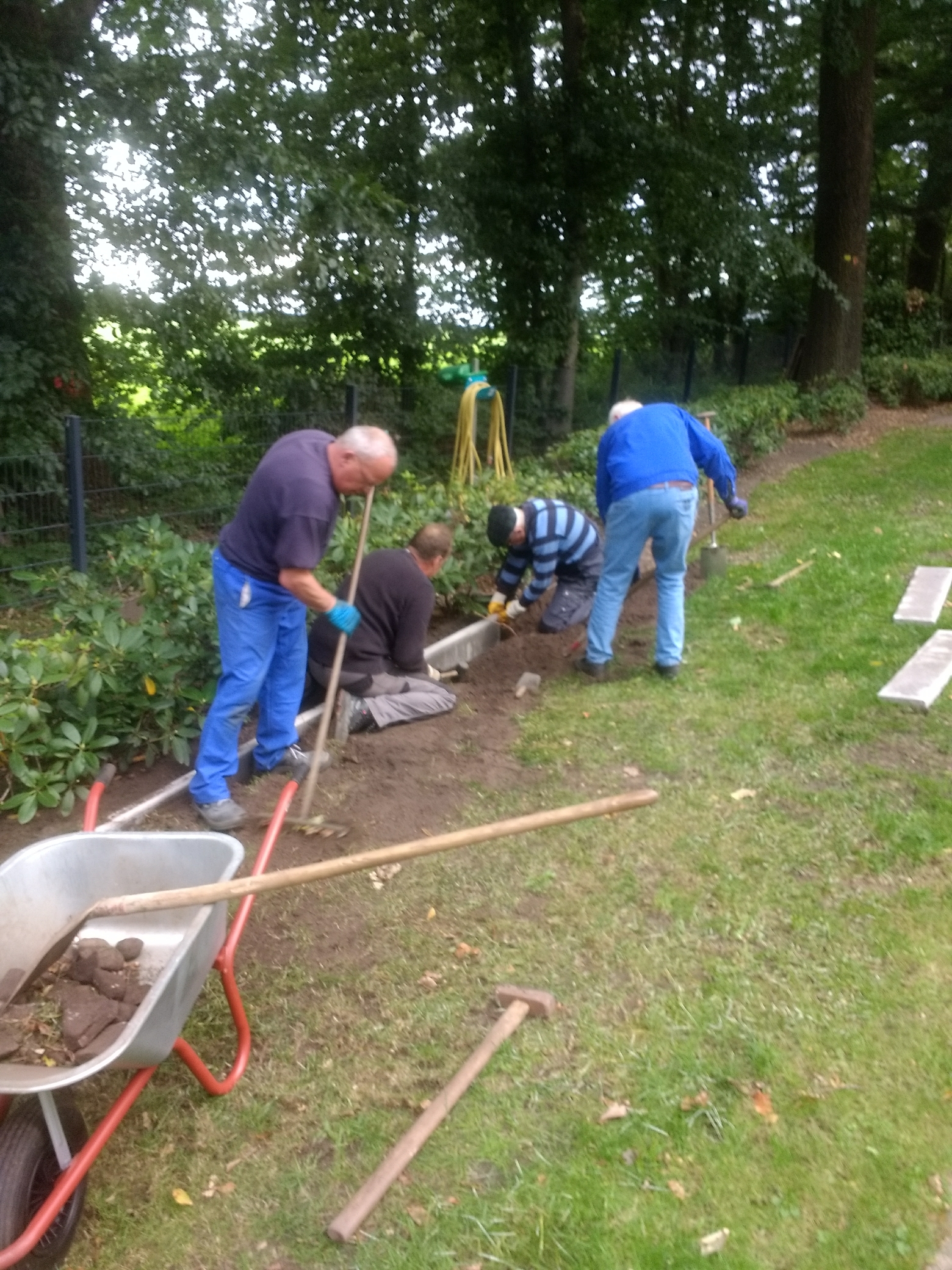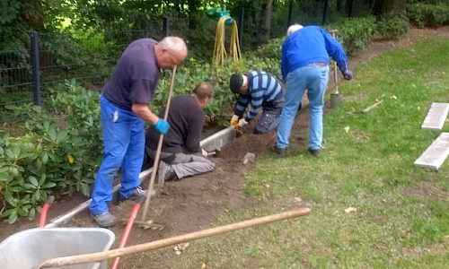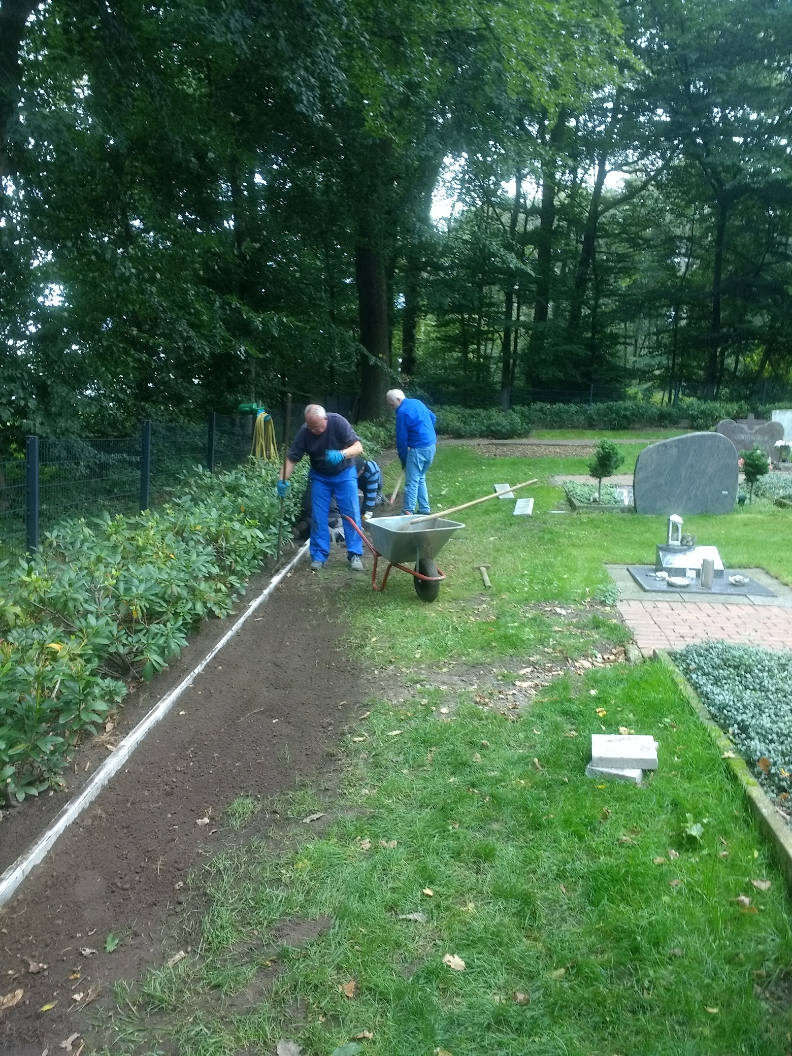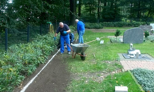 Man hatte sich noch einiges vorgenommen und teilte sich auf. Neben der üblichen Pflege der Anlagen wie Kanten schneiden, Laub entfernen, fegen pp. stand auch noch eine Baumaßnahme an. Auf der nördlichen Seite des Friedhofs sollte das Rhododendron-Beet noch vor dem Winter mit einer Betonkante eingefasst werden. Bei starkem Regen wurde in der Vergangenheit immer wieder die Erde aus dem Beet weggespült. Dies soll die Kante verhindern.