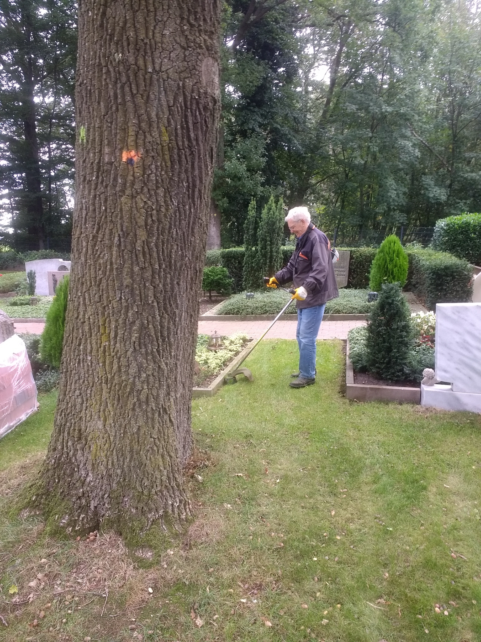 Am Montag kam das Gespräch in dieser Runde auch noch auf Laurenz Stöppel, der erst kürzlich verstorben ist und dessen Grab in Sichtweite zur Runde liegt. Man erinnerte sich an Laurenz, den alle insbesondere als Maschinenführer geschätzt haben und der lange Jahre in der Gruppe mitgearbeitet hat. Ohne ihn, da war man sich einig, wären die Wege auf dem Friedhof nicht so hervorragend mit Klinker gepflastert.