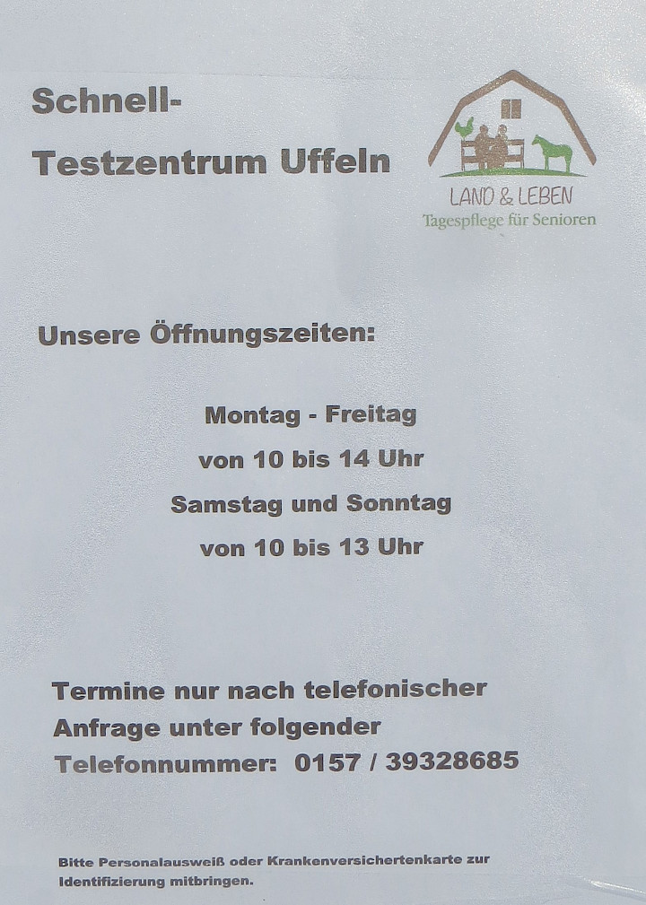 Die Uffelnerinnen und Uffelner haben zukünftig kurze Wege zum nächsten Testzentrum, wenn sie sich kostenlos auf Corona testen lassen wollen. Die Tagespflege „Land & Leben“ betreibt seit kurzem in Uffeln auf dem Saal der Gaststätte Helmer, Uffeln Mitte 14, mit Genehmigung der Kreises Steinfurt ein Testzentrum, in dem Bürgerinnen und Bürger einen kostenlosen Schnelltest machen lassen können.