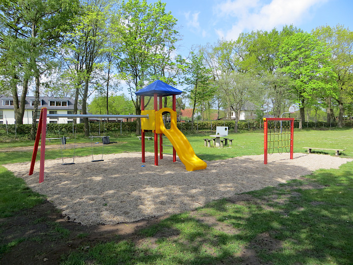 Udo Bolsmann als Projektleiter und sein Helferteam haben gute Arbeit geleistet. Die Geräte sind mit derben Betonfundamenten verankert und 40 cm Fallschutzkies, gesponsert von der Fa. Bergschneider, sind großflächig unter den Geräten eingebracht und sorgen für Sicherheit. Und so ist in Verbindung mit den zertifizierten Spielgeräten eine Anlage entstanden, die den Normen für Spielplätze entspricht. Darauf hat die Stadt geachtet, die sich in der Verantwortung für den kleinen Spielplatz sieht.