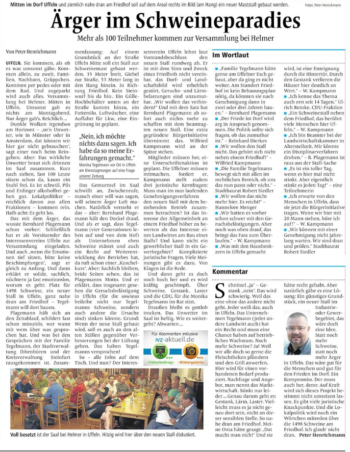 Die IVZ berichtete am 30.7 auf der ersten Lokalseite ganzseitig über die Versammlung. Auch wenn der Titel aus Sicht der BI nicht ganz glücklich war, so war die Berichterstattung doch das, was notwendig war, um der Sache in Uffeln und in der Politik den richtigen Schub zu verleihen.