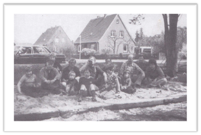 Rechtzeitig zum ersten Siedlungsfest aus Anlass des 30-jährigen Bestehens wurden in Eigenleistung und ohne öffentliche Mittel neben der Rasenfläche zum Bolzen ein Sandkasten und weitere Spielgeräte aus Holz und Metall errichtet. Die Kletterstange wurde z.B. aus alten Feldbetten der Bundeswehr geschweißt.