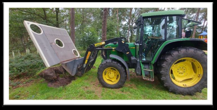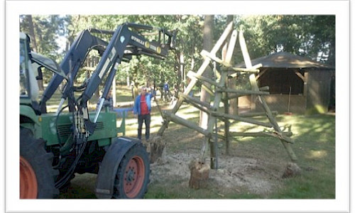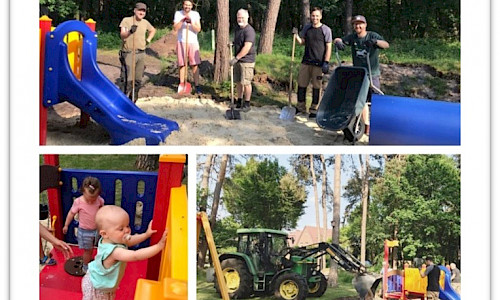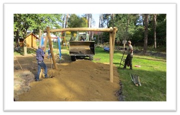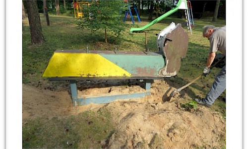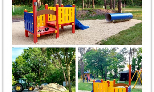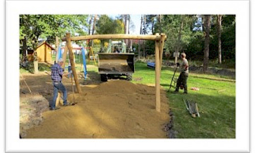 30 Tonnen Fallschutzsand wurden mit dem Trecker verteilt, der Großteil unter dem neuen Spielgerät. Der Rest wurde unter den angrenzenden Spielgeräten aufgetragen, da die letzte TÜV Begehung dies eingefordert hatte. Kaum war der erste Sand verteilt, spielten schon die ersten Kleinkinder begeistert auf dem neuen Spielgerät.