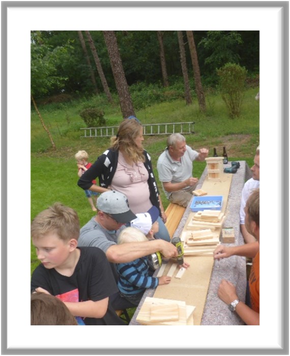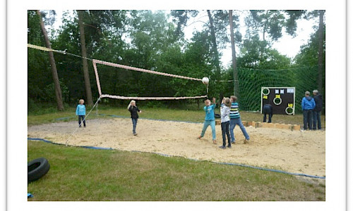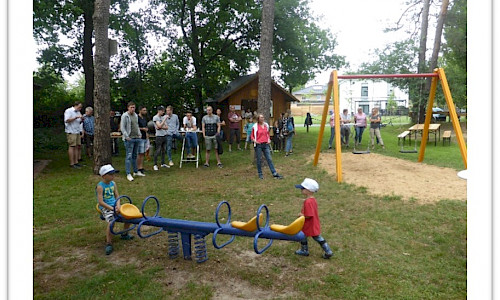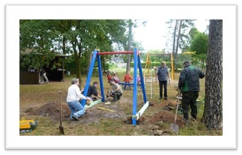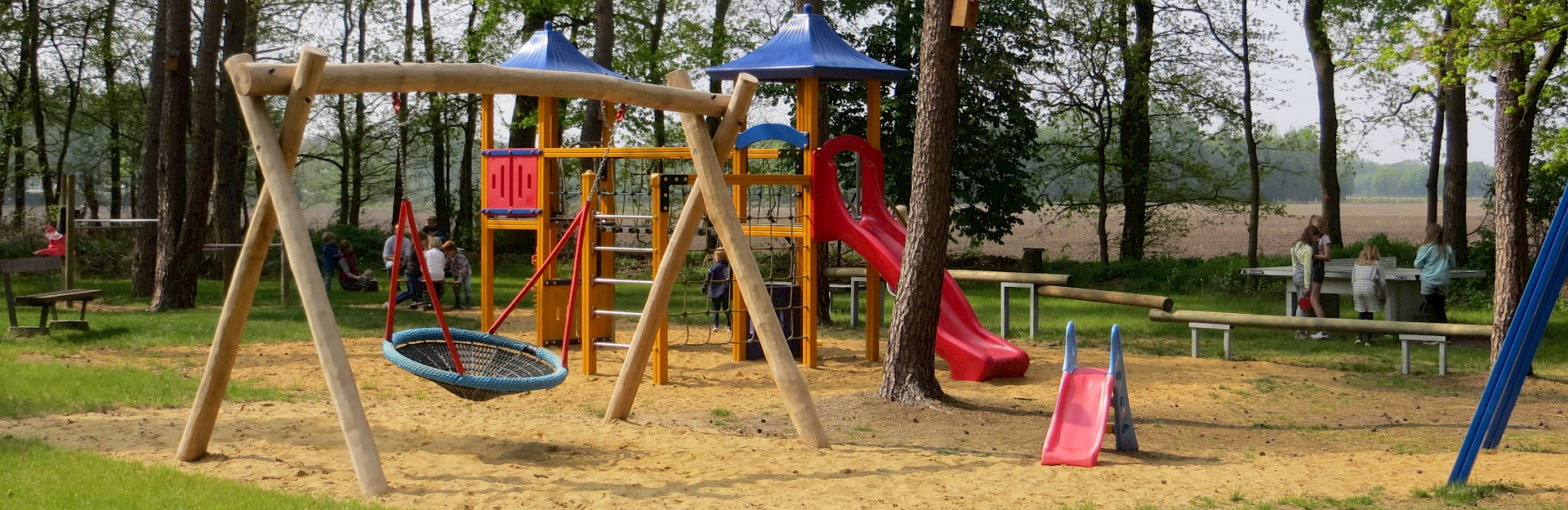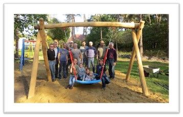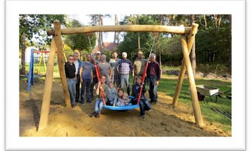 Es fehlte aber noch ein neues Spielgerät, eine Vogelnestschaukel. Im Oktober wurde die Nestschaukel endlich geliefert und in Eigenleistung aufgestellt. Sie ist aus dem besonders wetterfesten Robinienholz und hat mit dem Fallschutzsand über 3.000 € gekostet. Möglich wurde die Anschaffung durch die Spenden im Rahmen der Crowdfunding-Projekte bei der VR-Bank Kreis Steinfurt (heute Volksbank im Münsterland) und der Kreisparkasse Steinfurt.